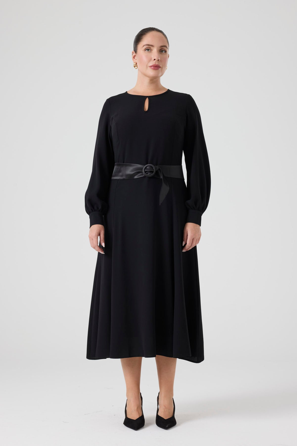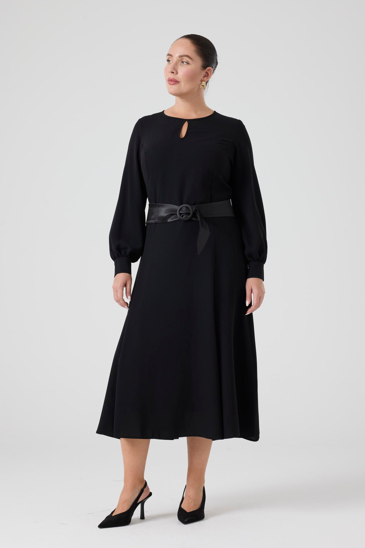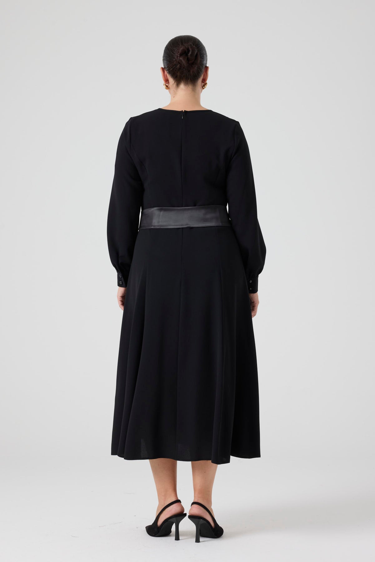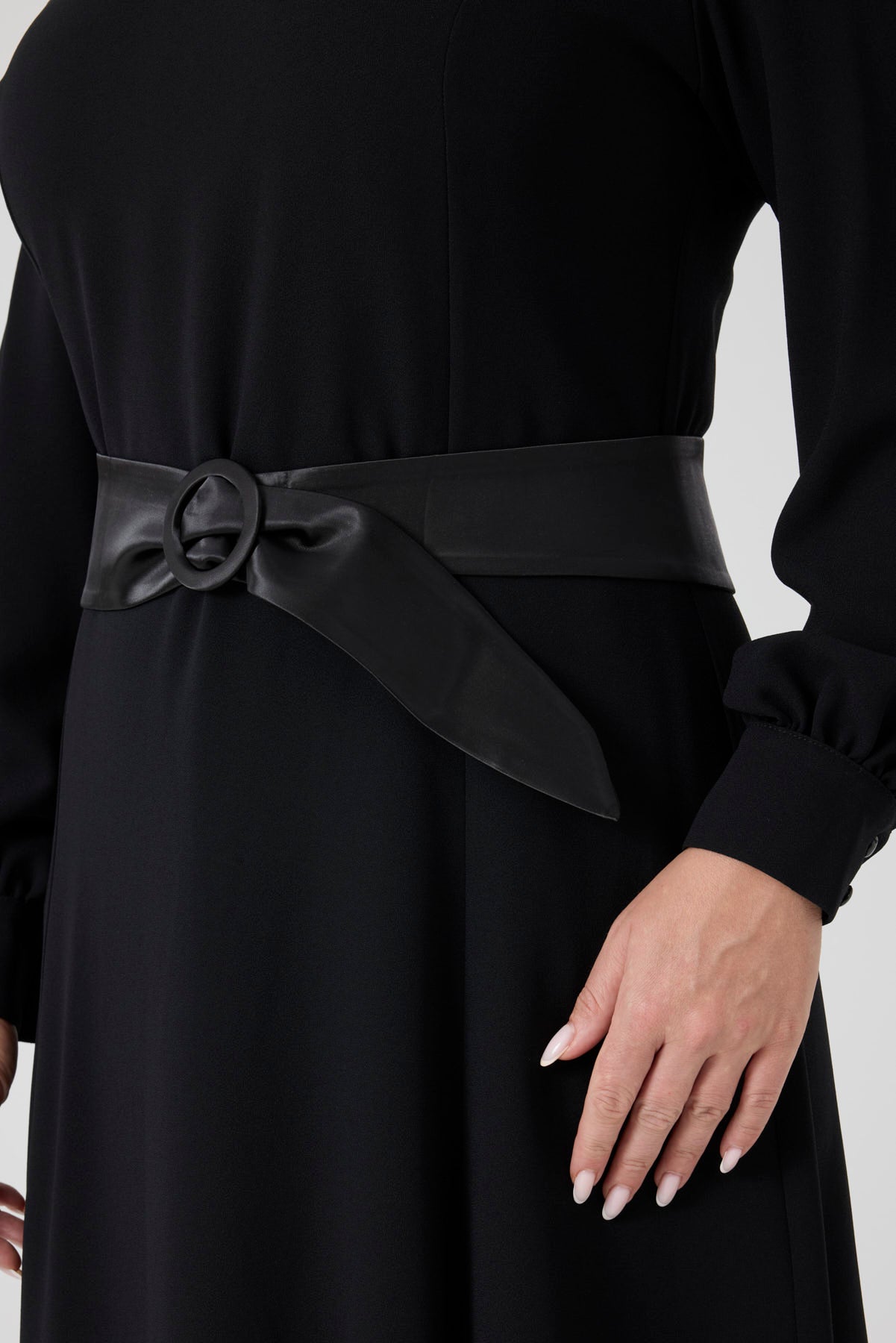 Saten Kemerli Kloş Elbise Siyah