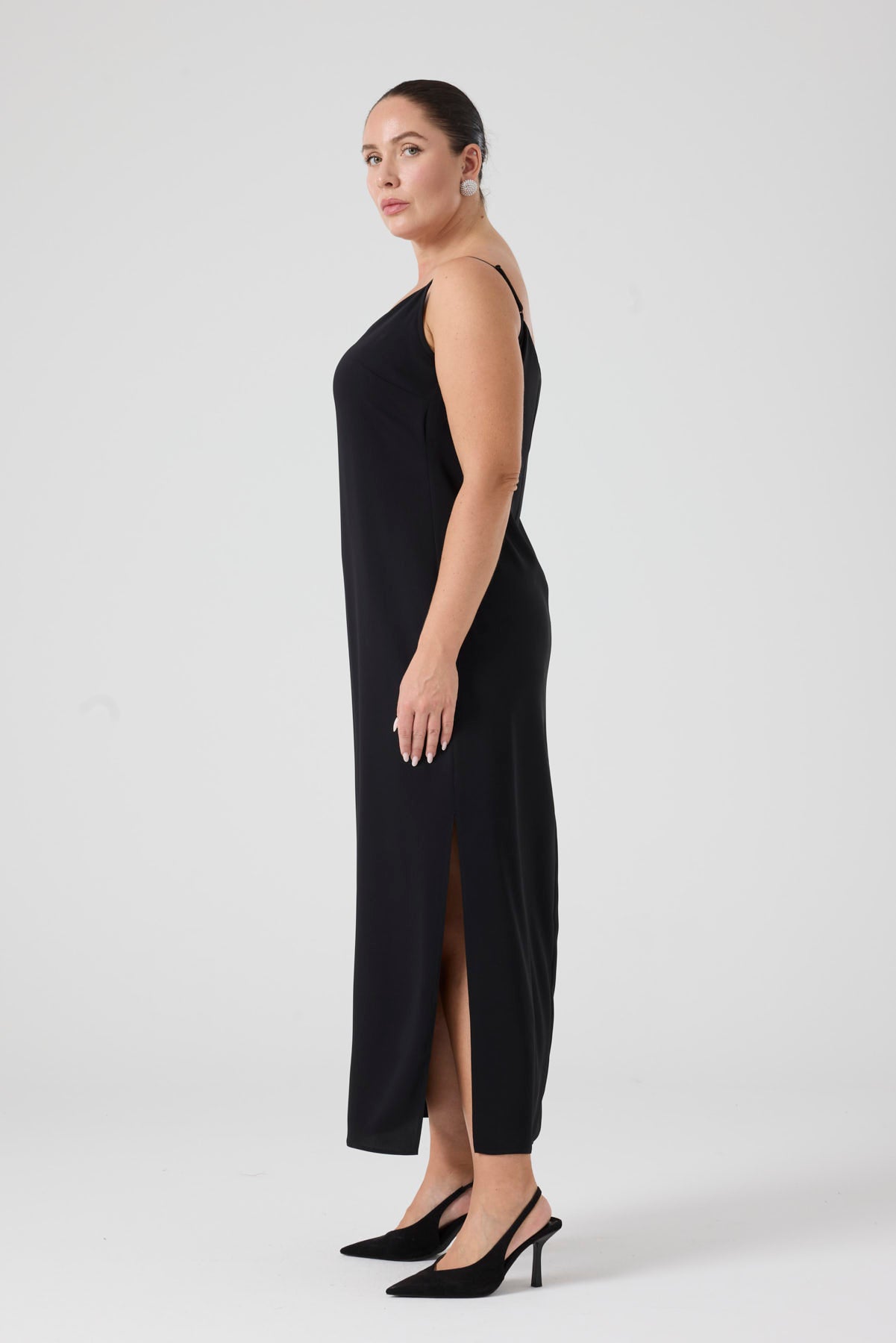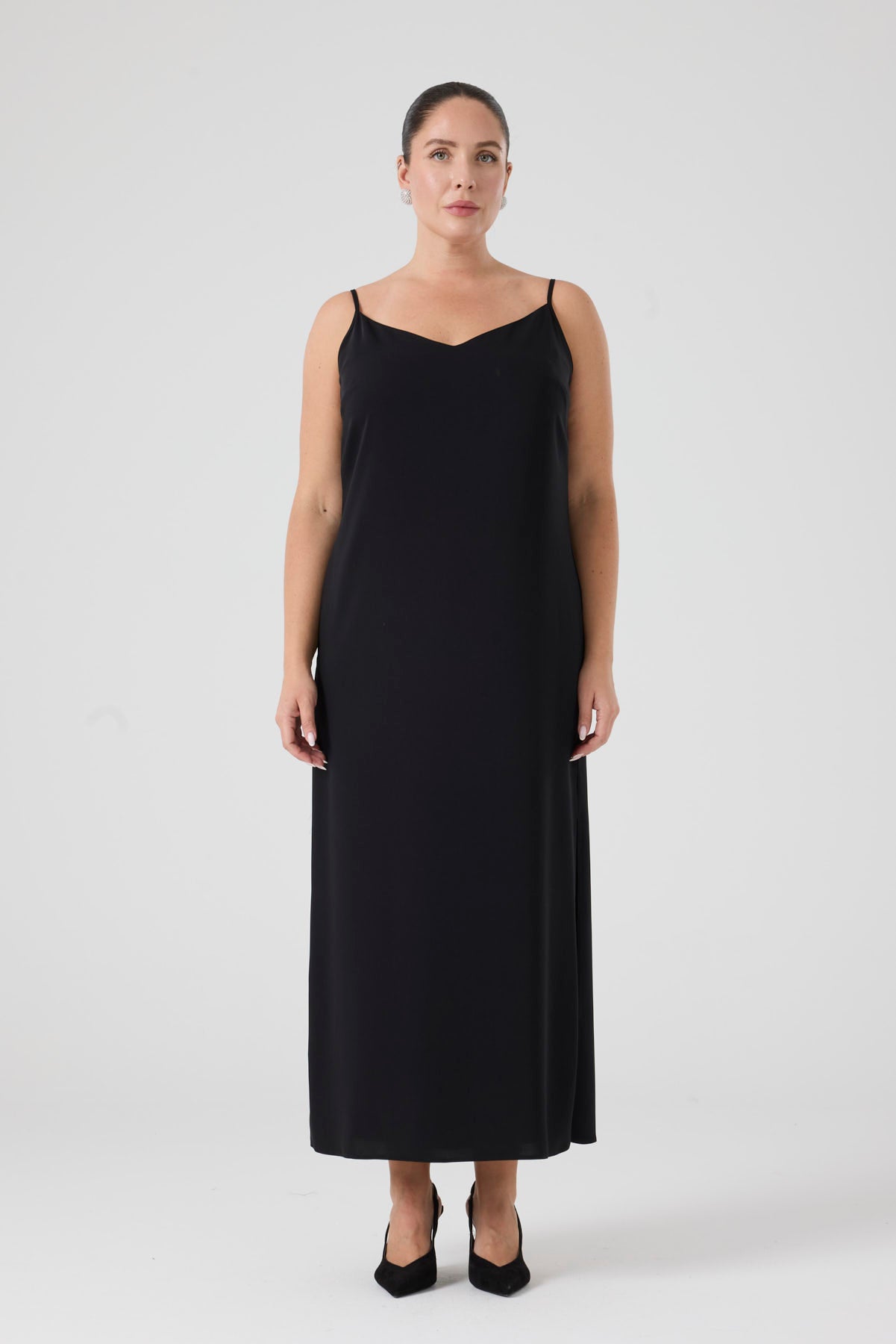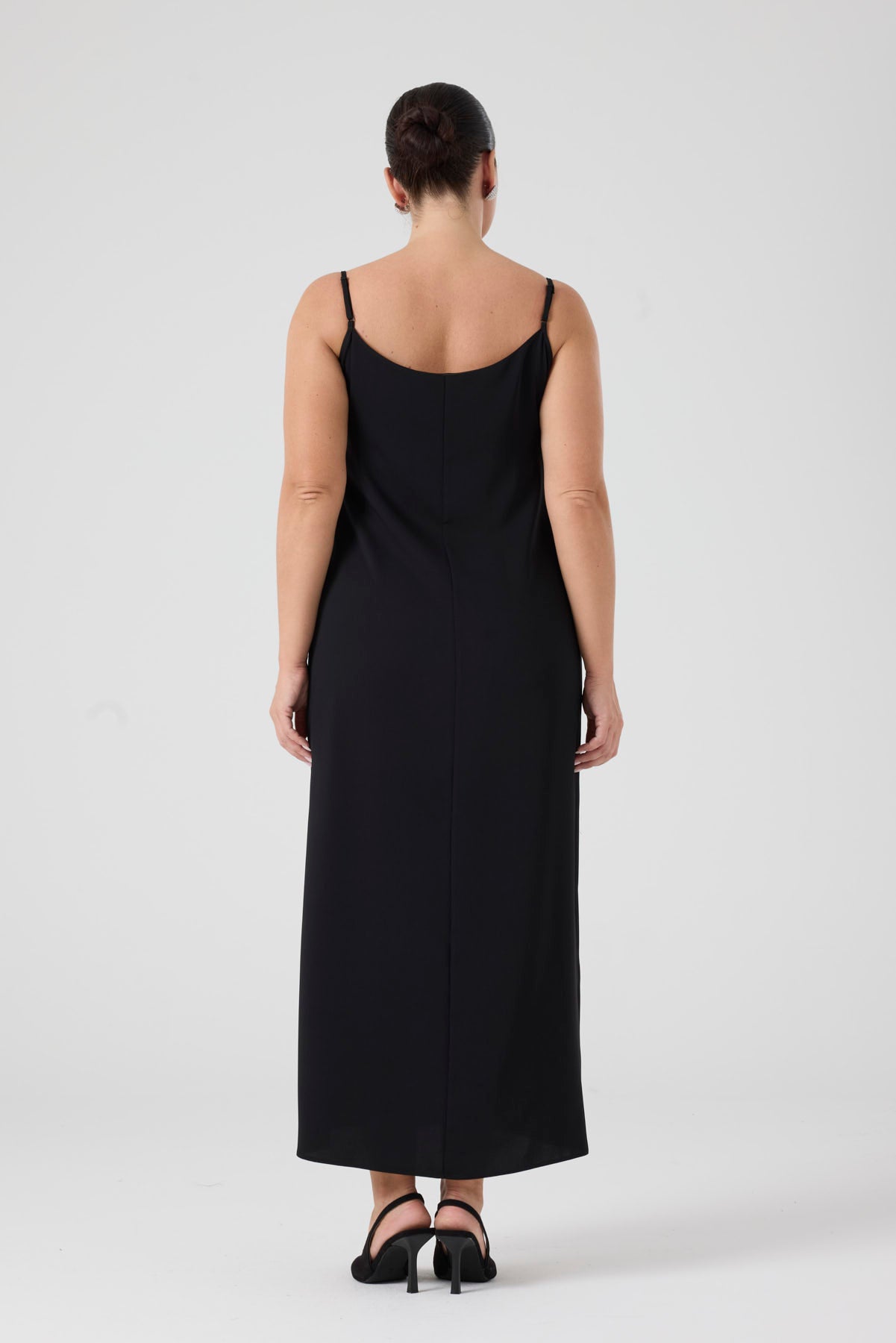 Elbise adriana kumaştan üretilmiş olup ince askılı ve yandan yırtmaçlıdır.