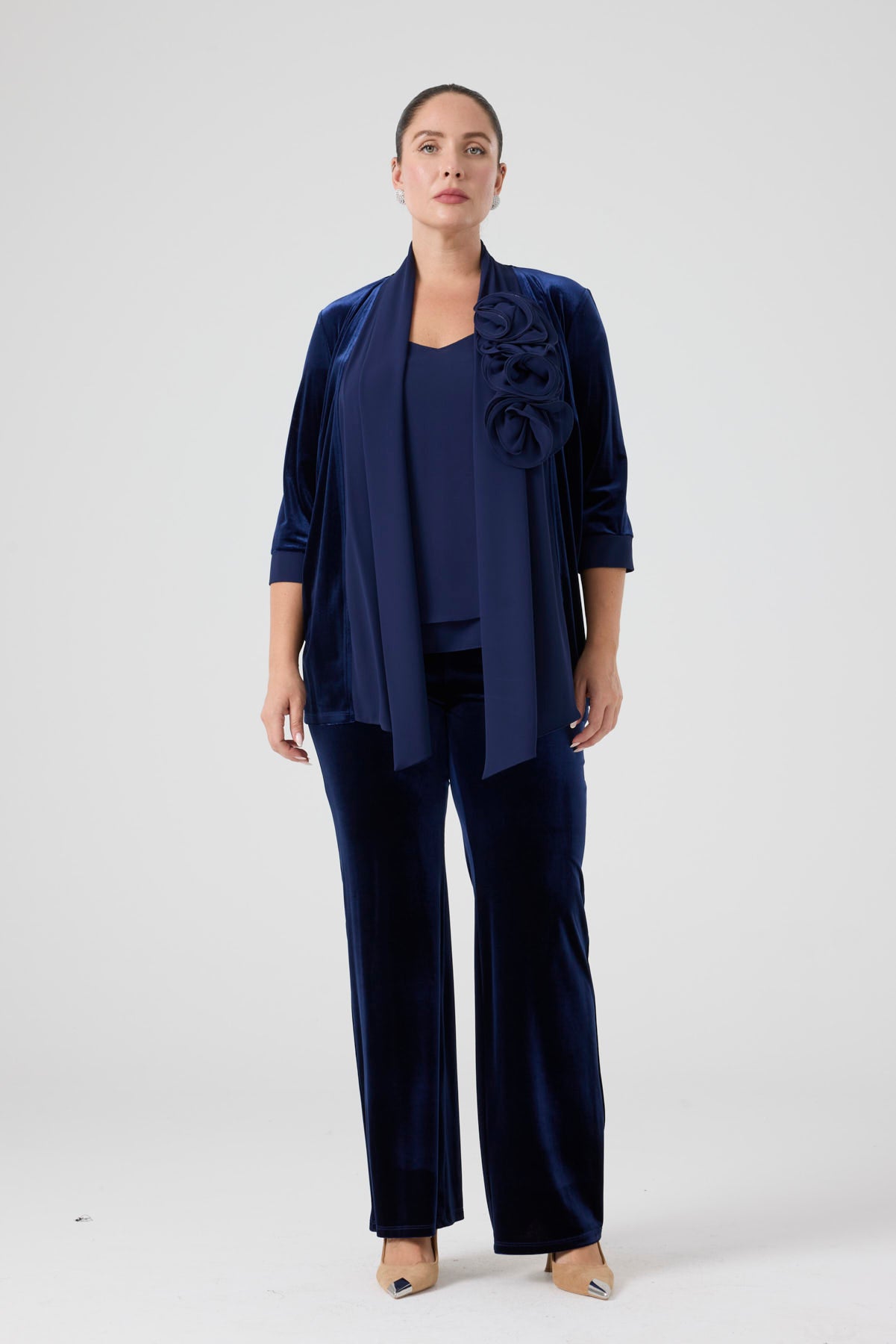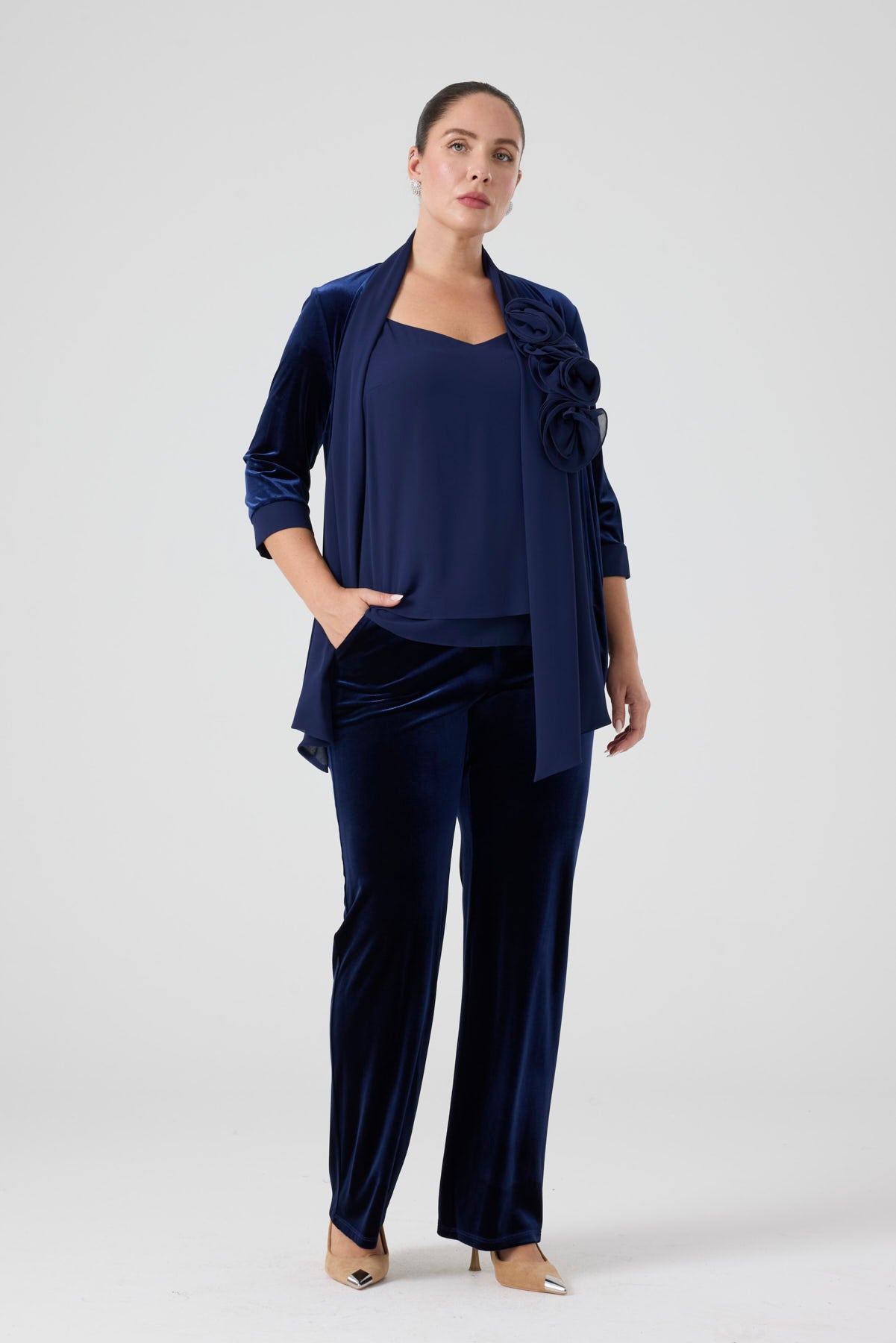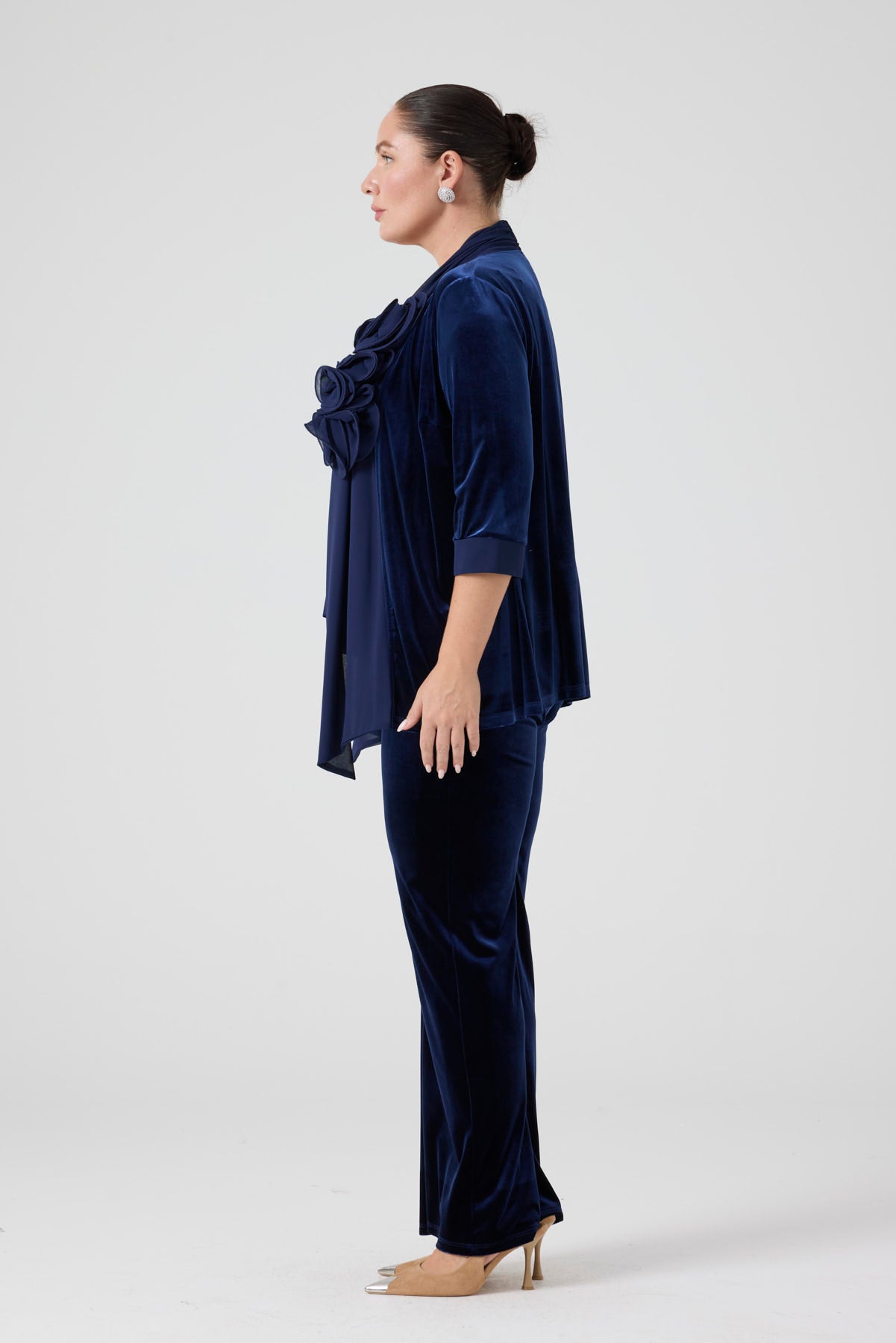 Şifon Garnili Burgu Çiçek Detaylı Ceket Kadife Pantolon 3'lü Takım - Lacivert