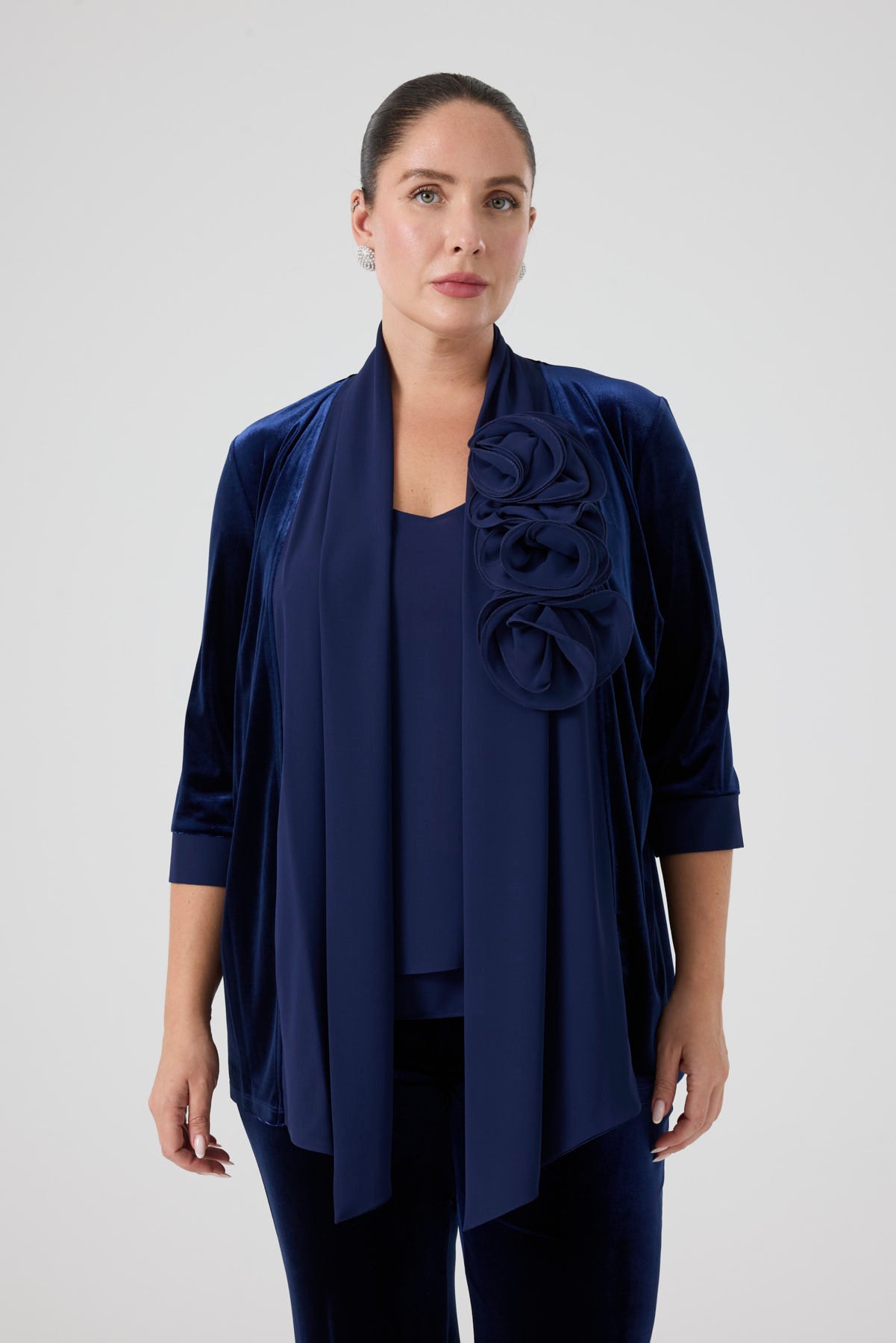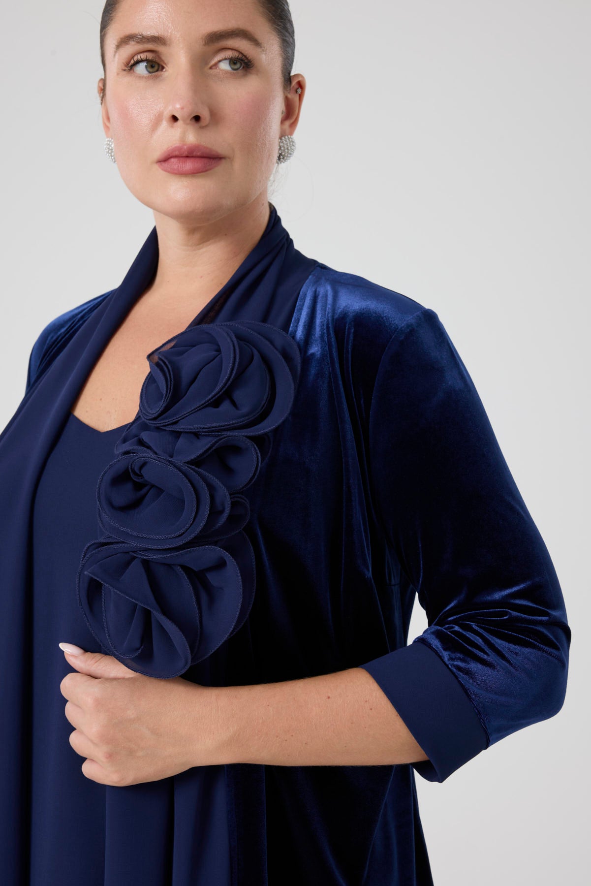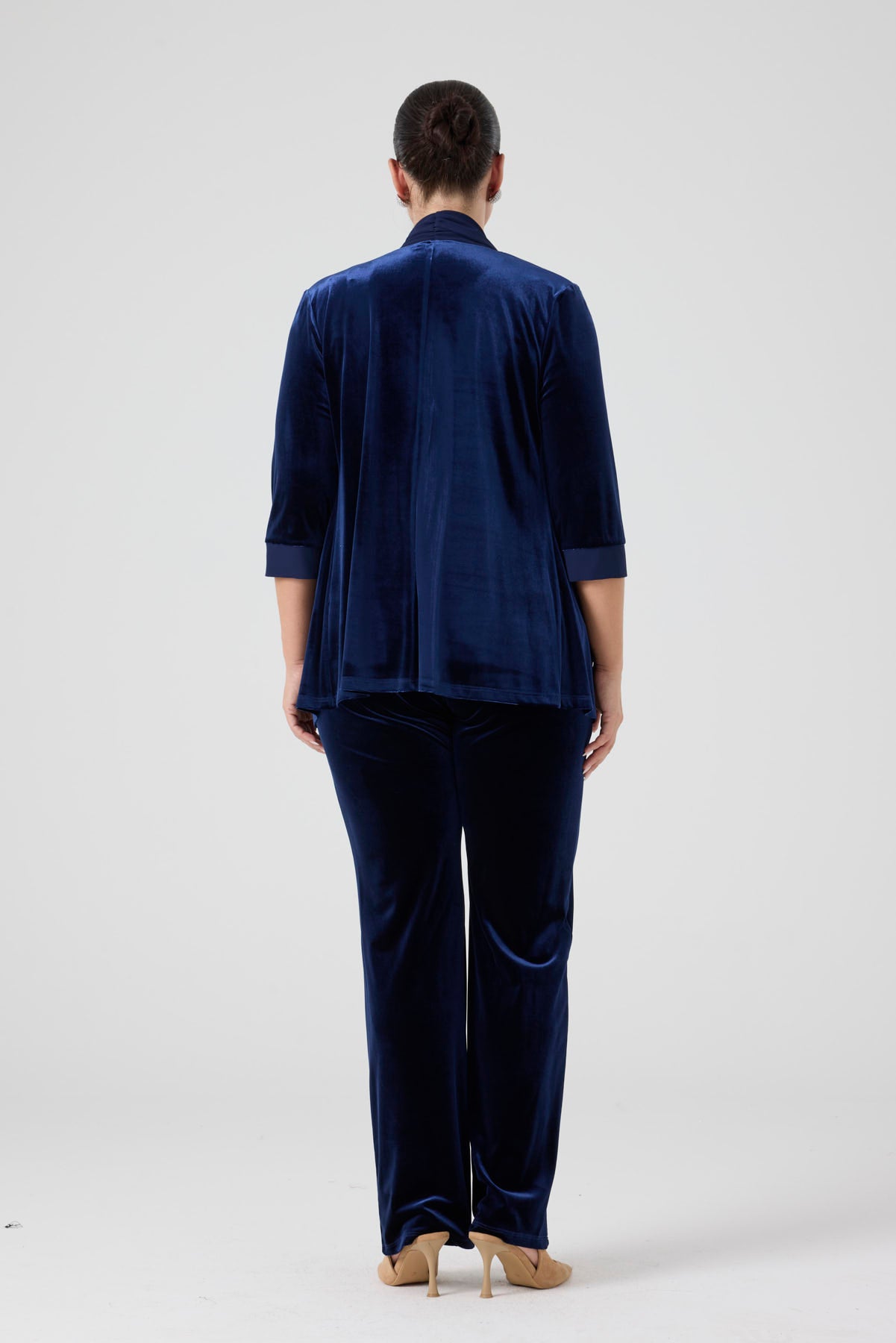 Şifon Garnili Burgu Çiçek Detaylı Ceket Kadife Pantolon 3'lü Takım - Lacivert
