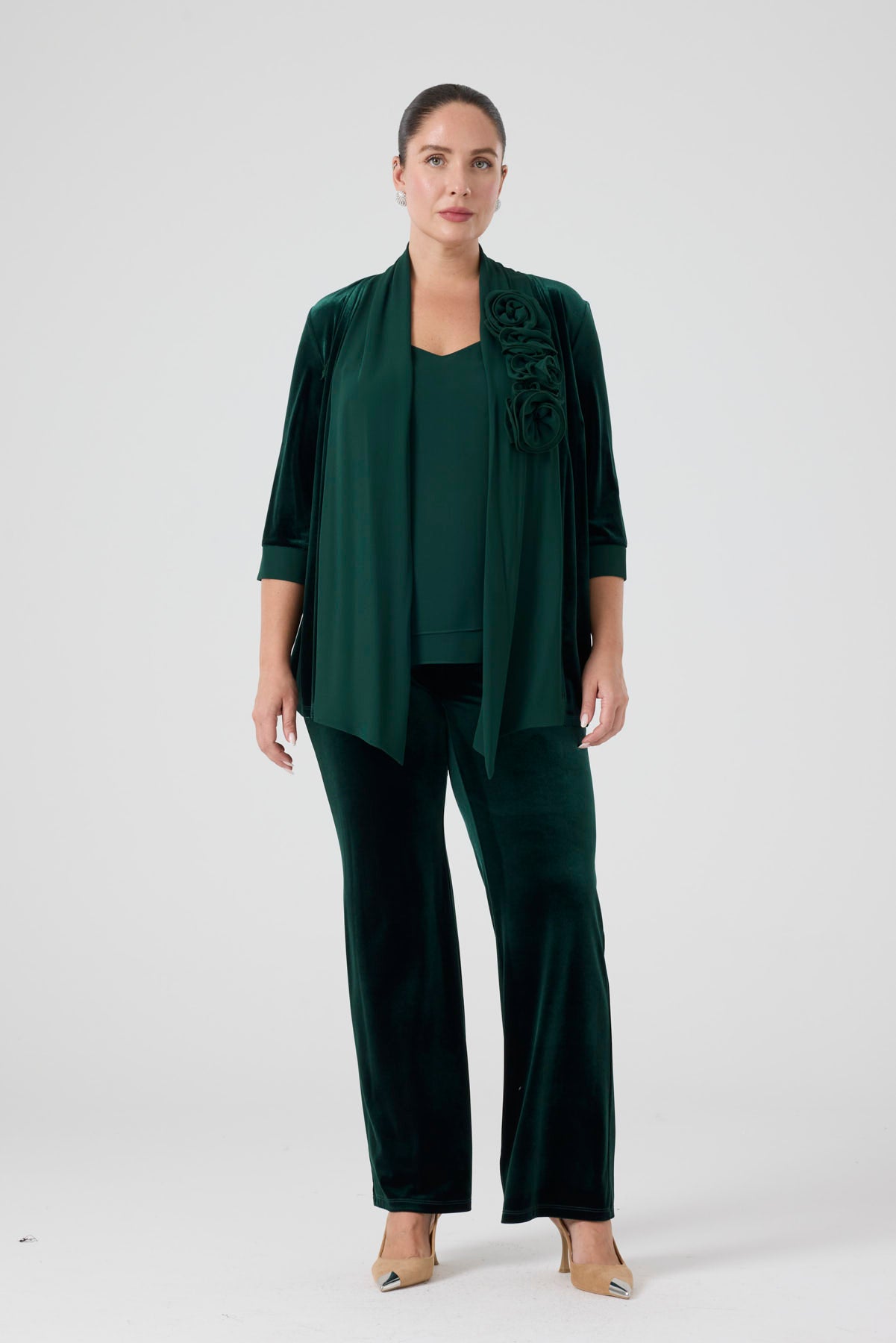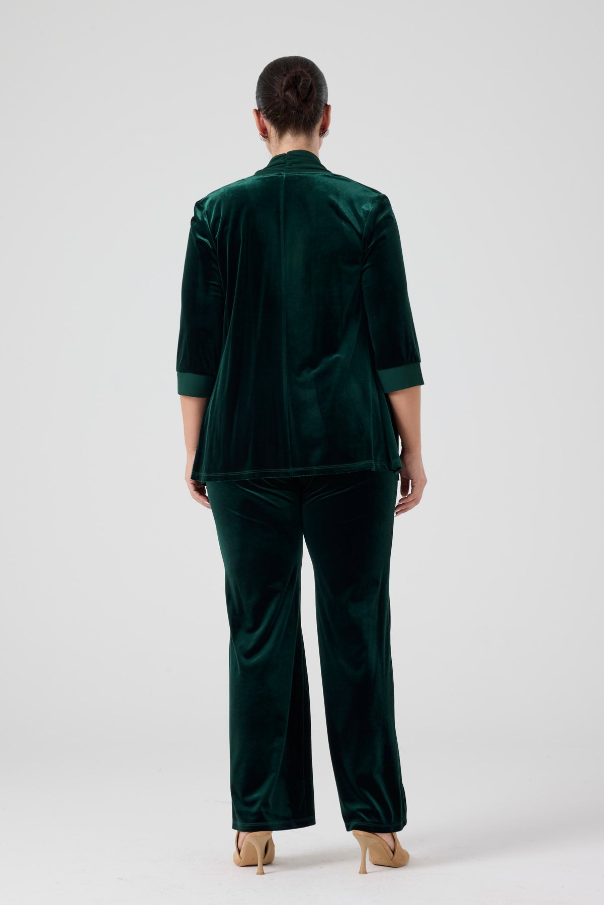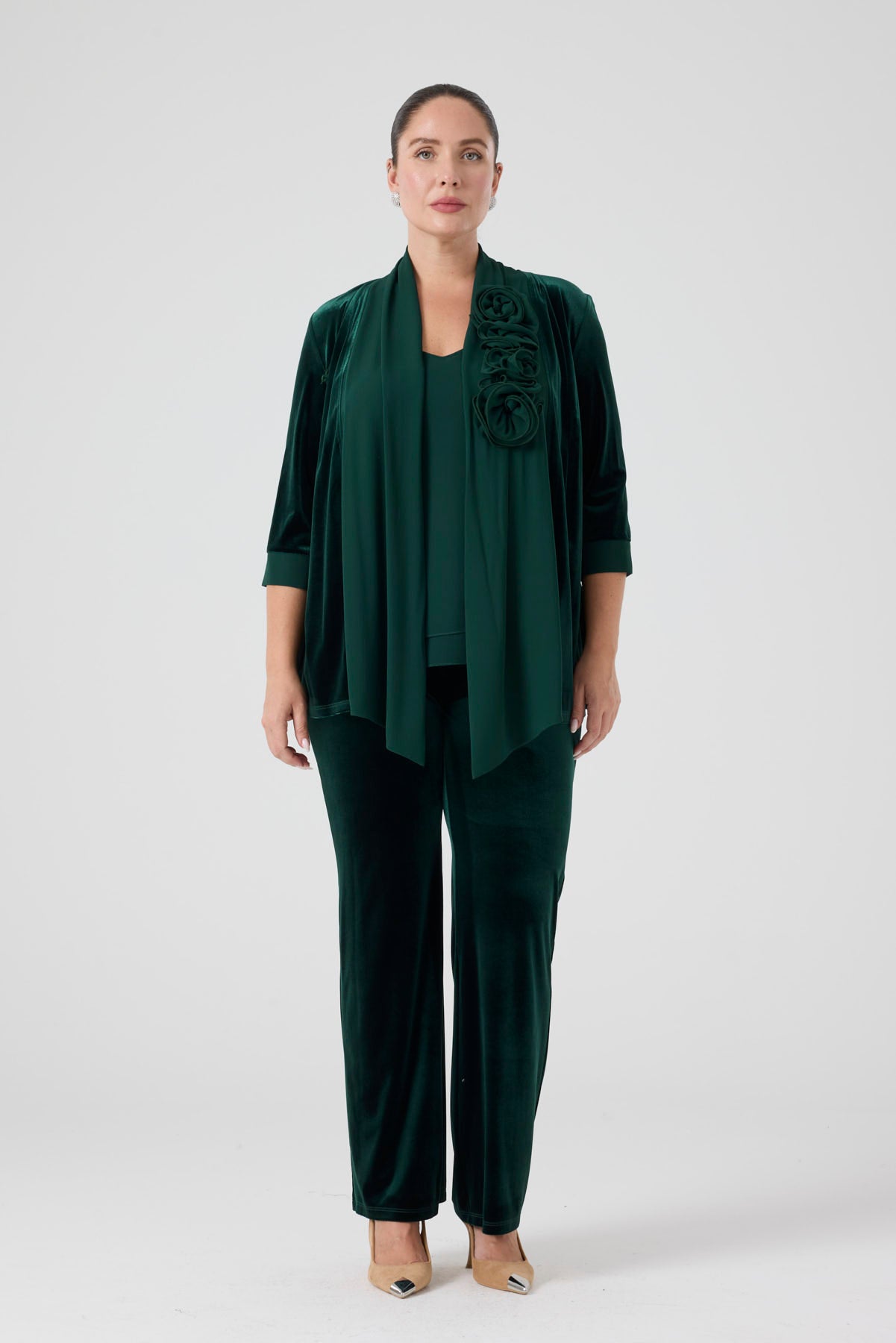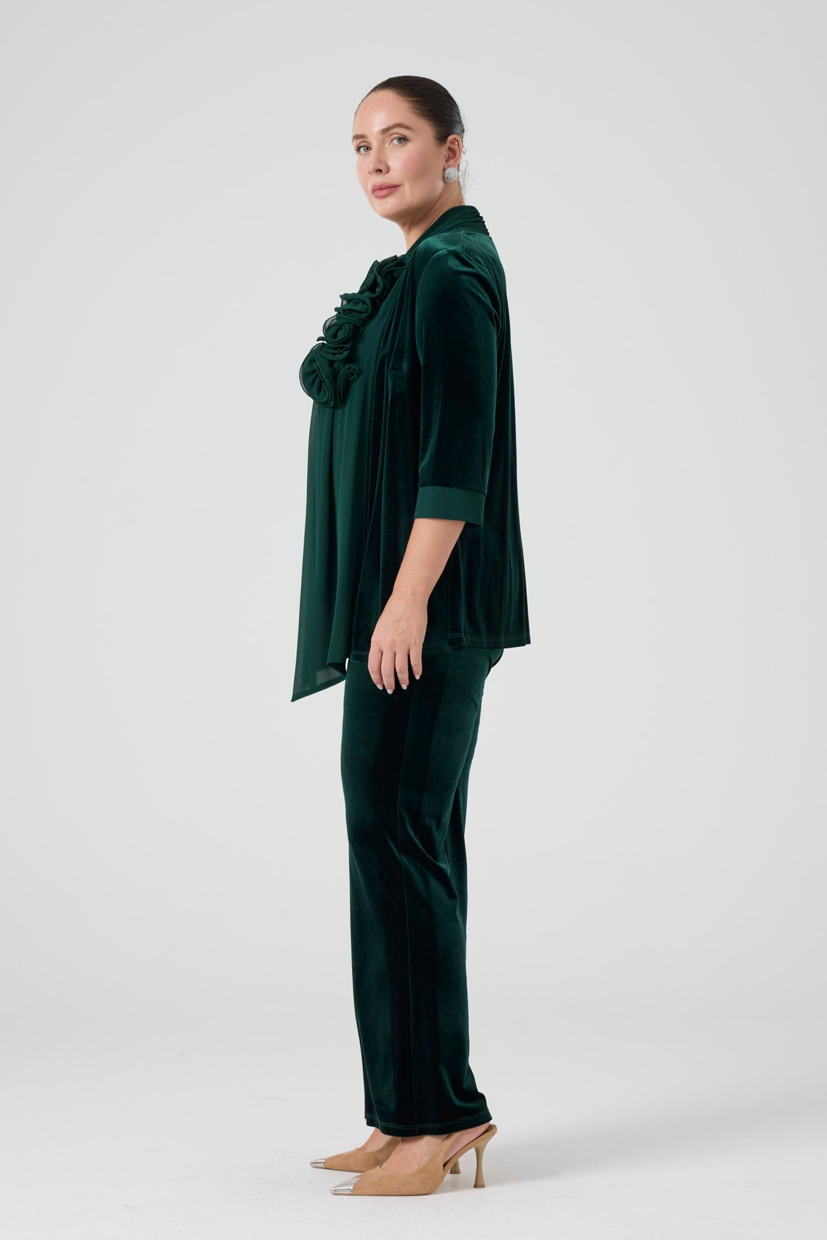 Şifon Garnili Burgu Çiçek Detaylı Ceket Kadife Pantolon 3'lü Takım - Zümrüt