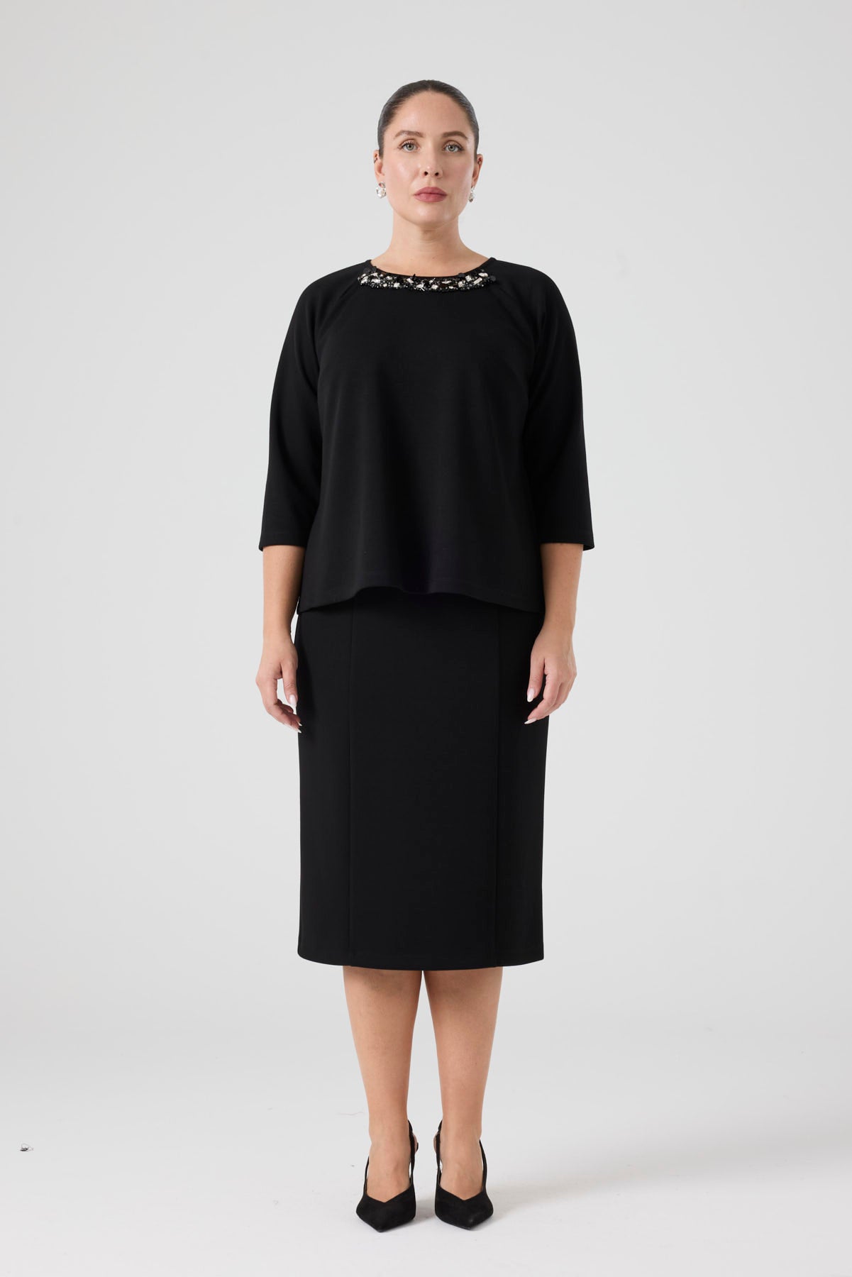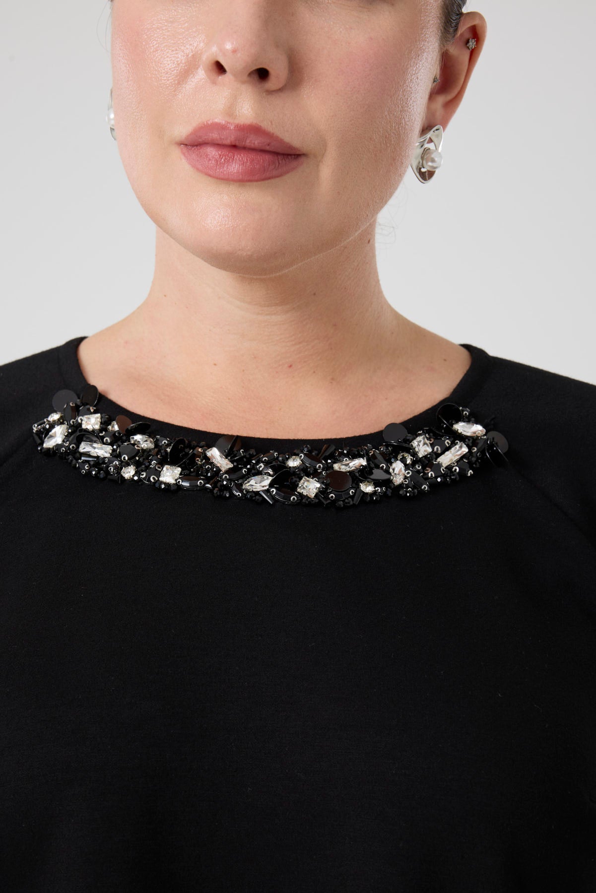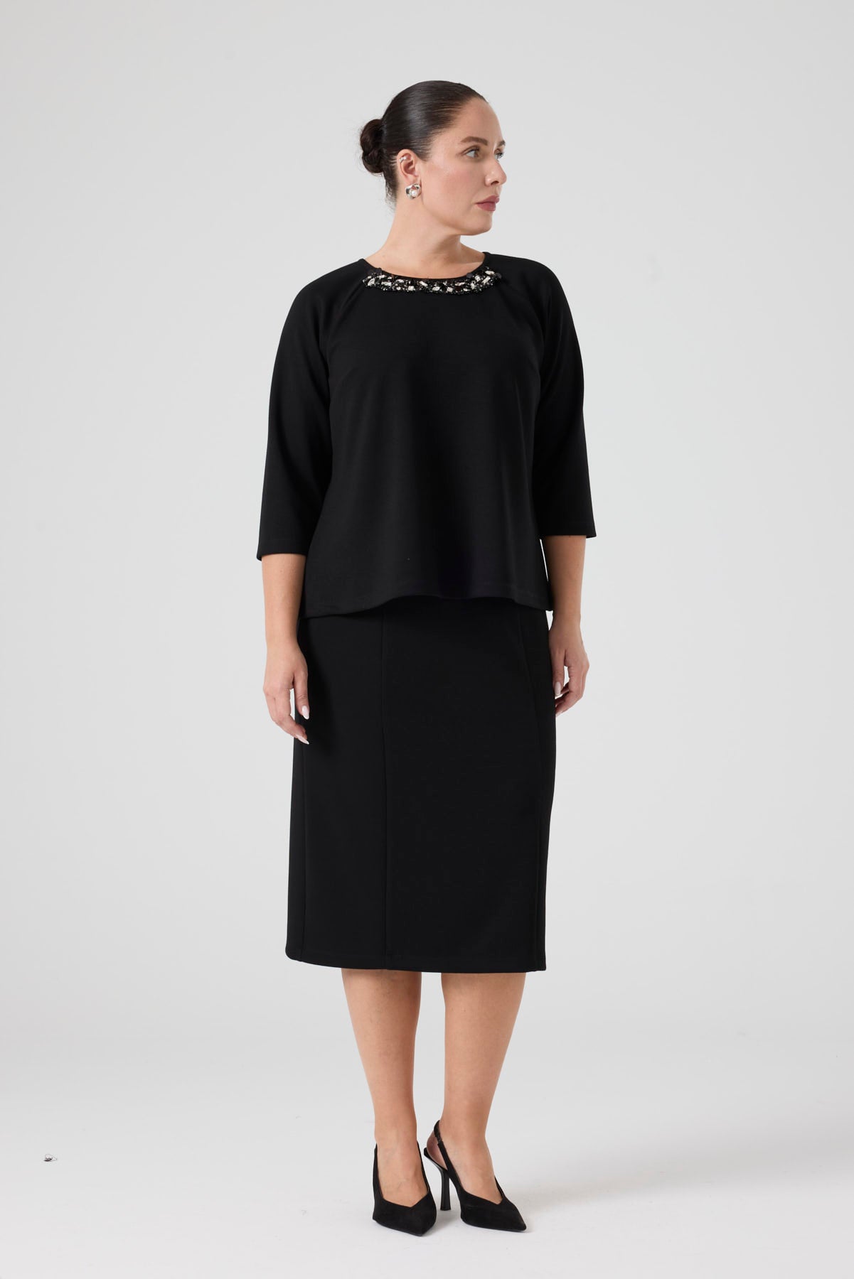 Yakası İşlemeli Örme Etek Bluz Takım Siyah