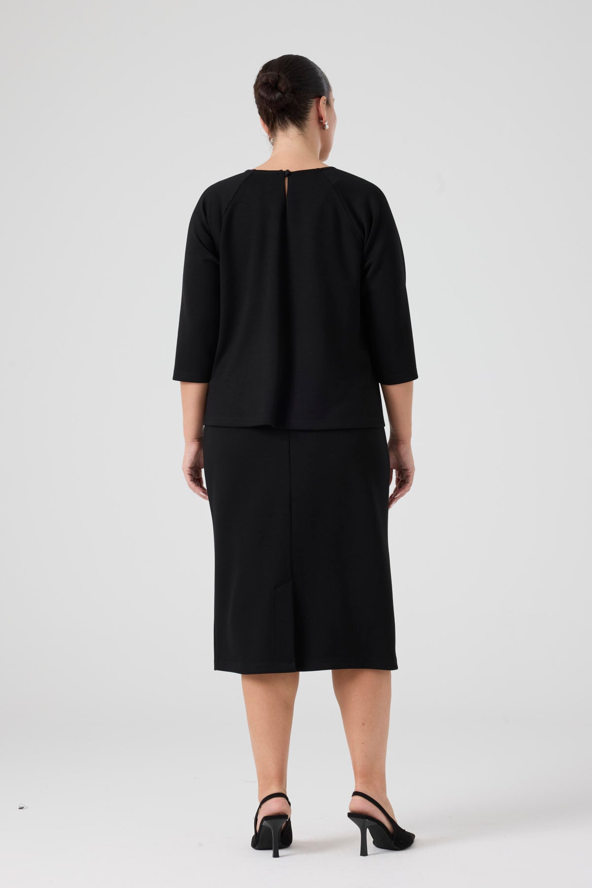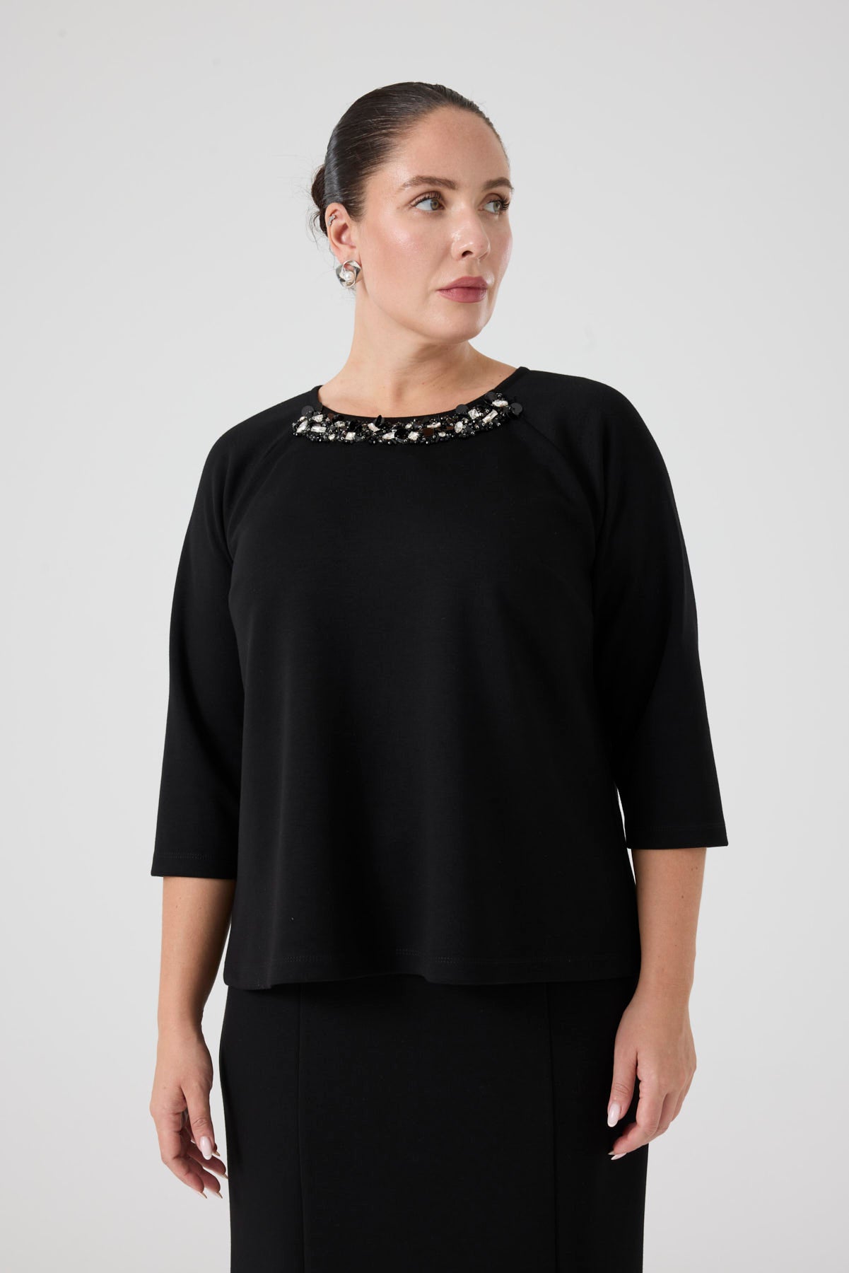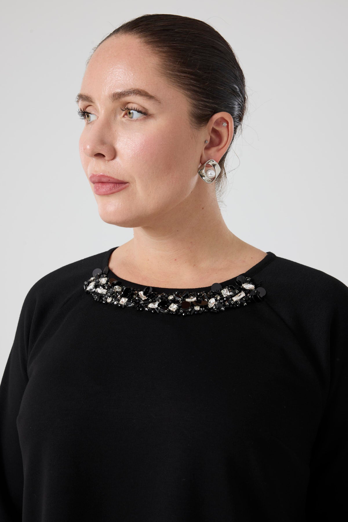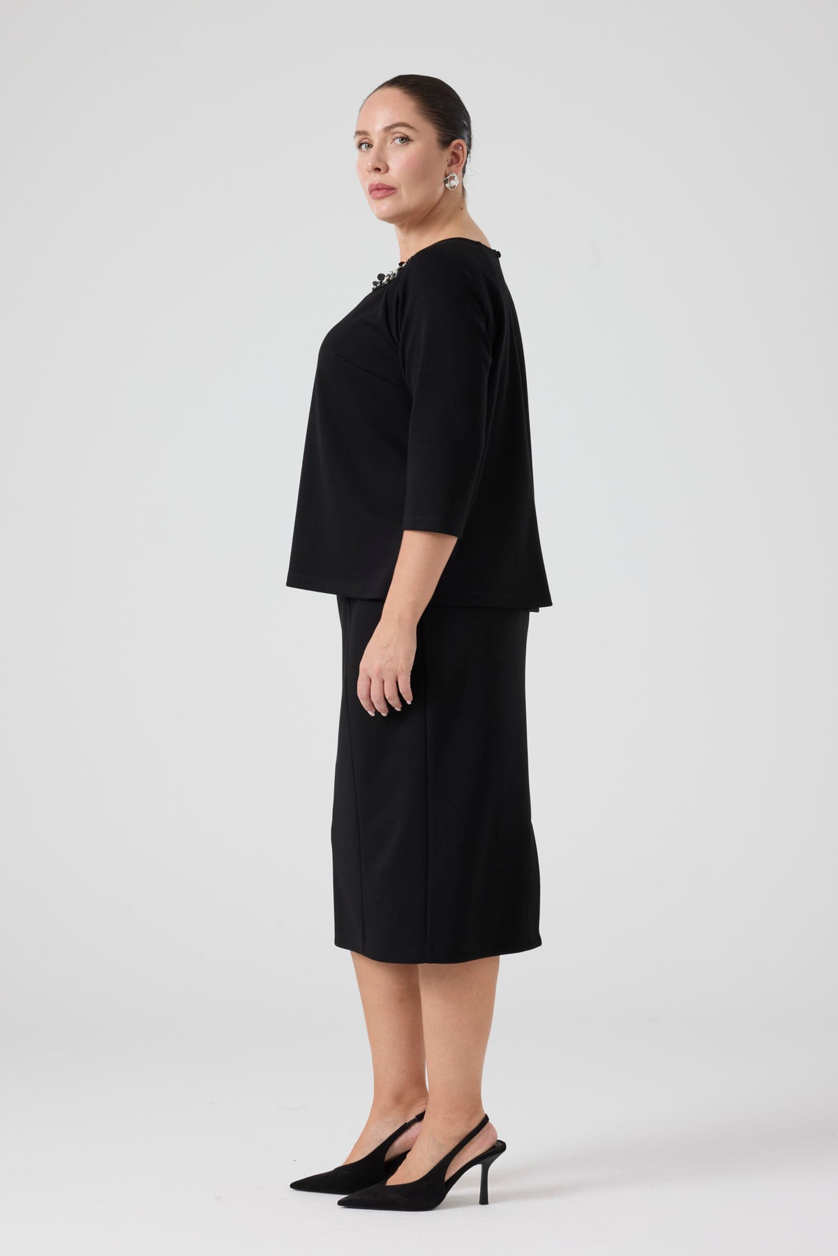 Yakası İşlemeli Örme Etek Bluz Takım Siyah