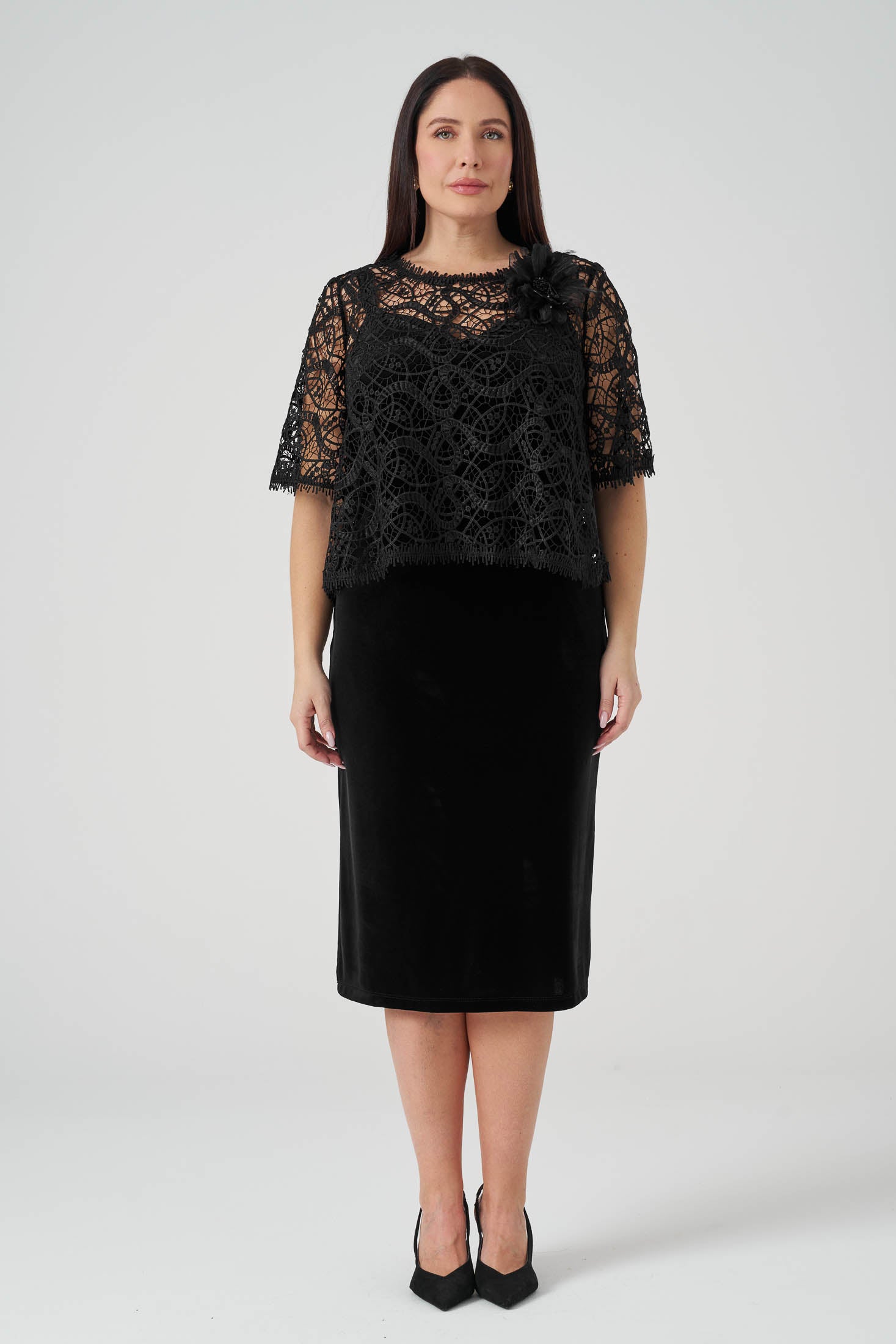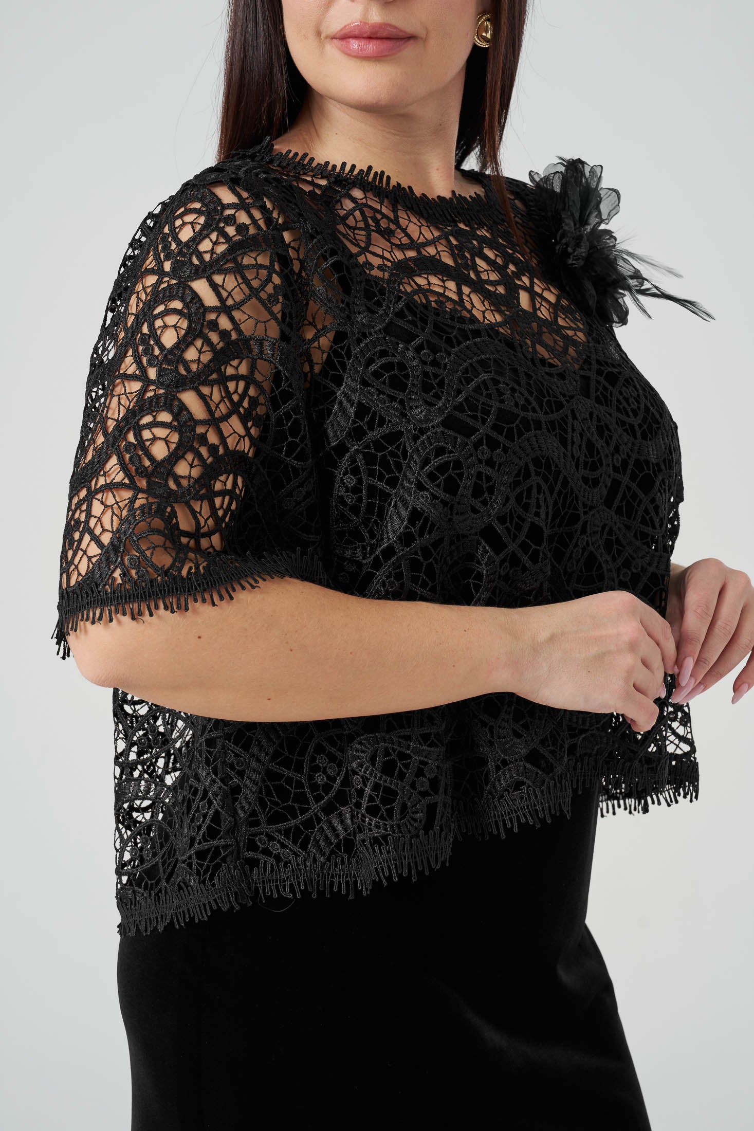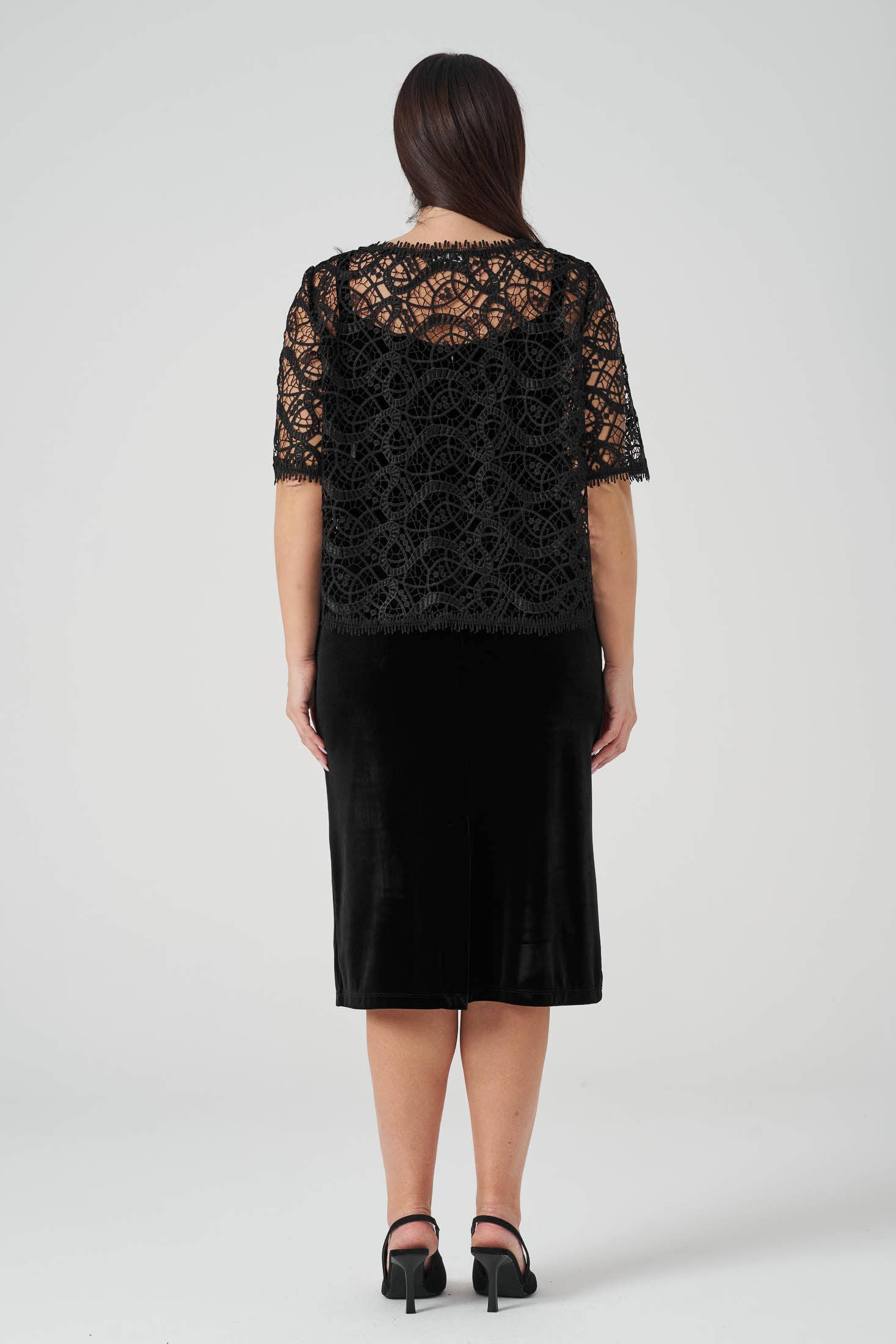 Güpür Bluzlu Kadife Elbiseli Takım Siyah
