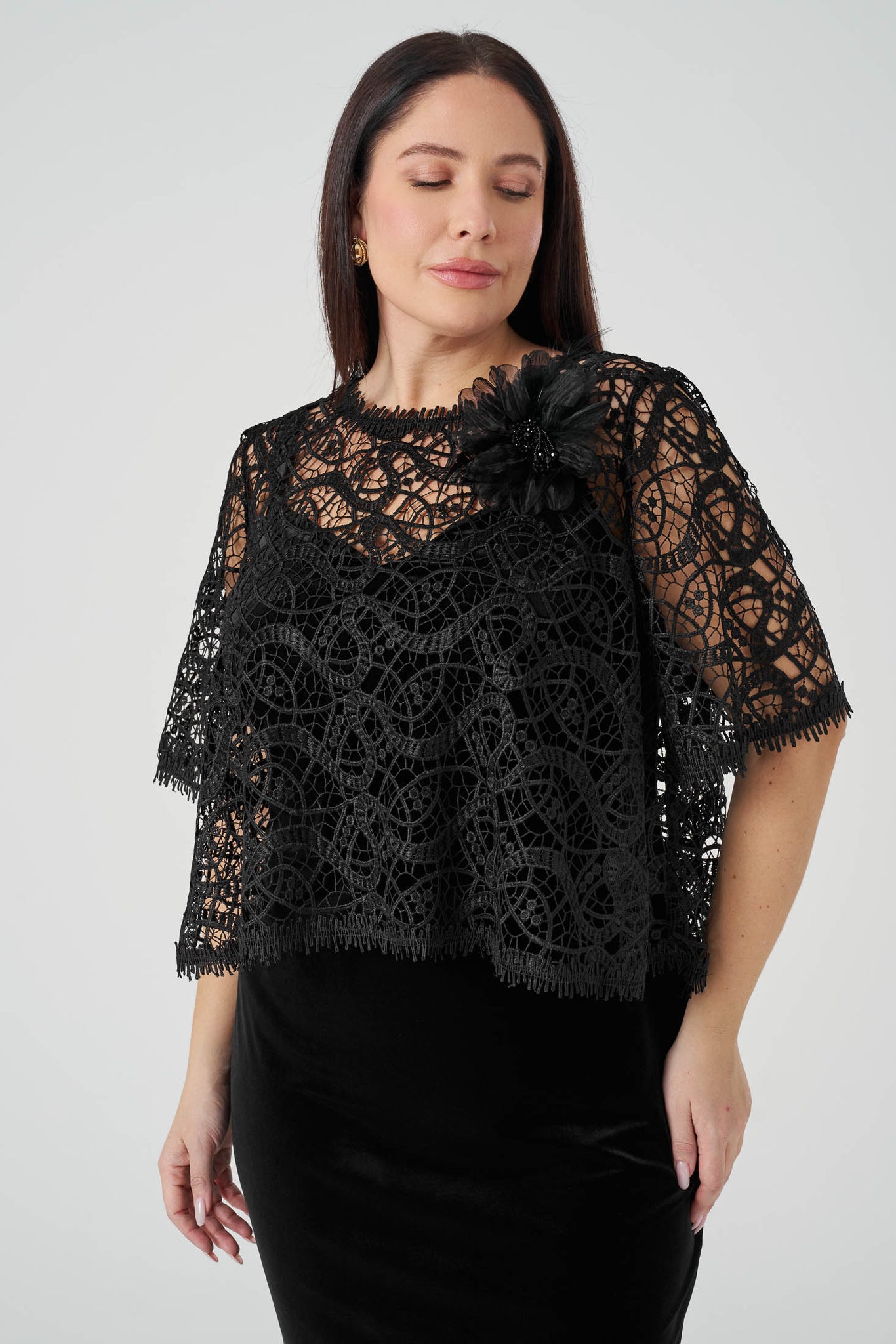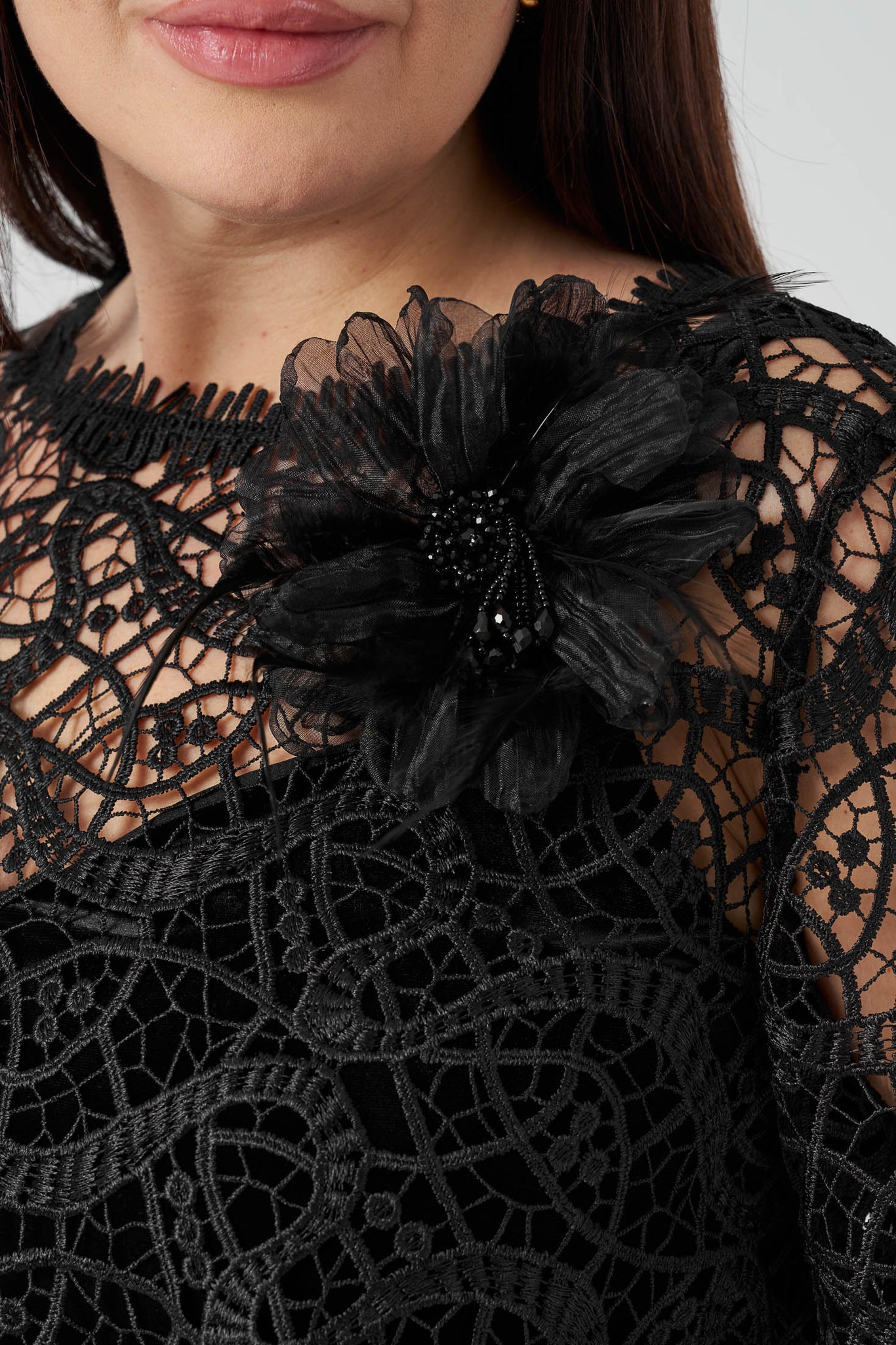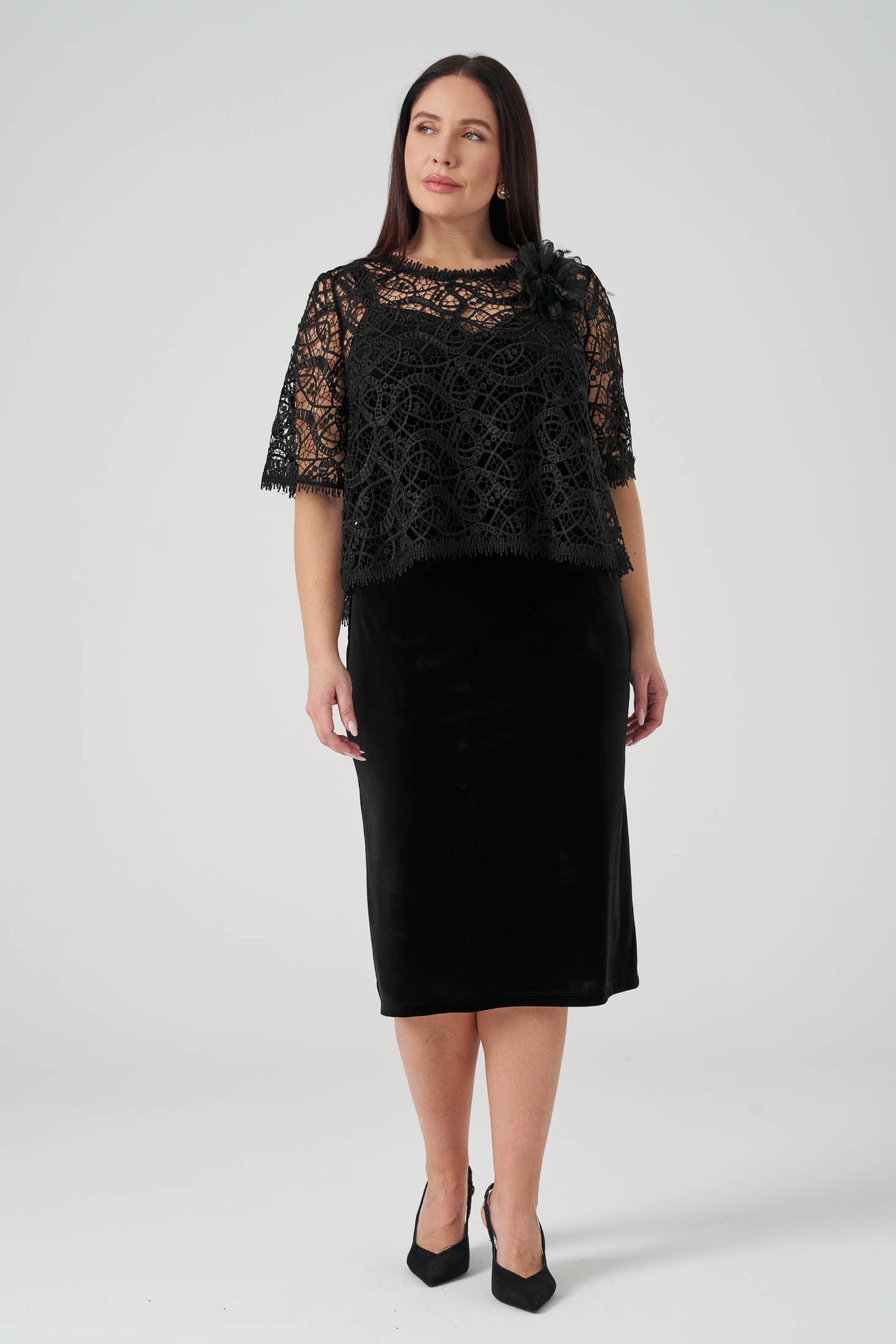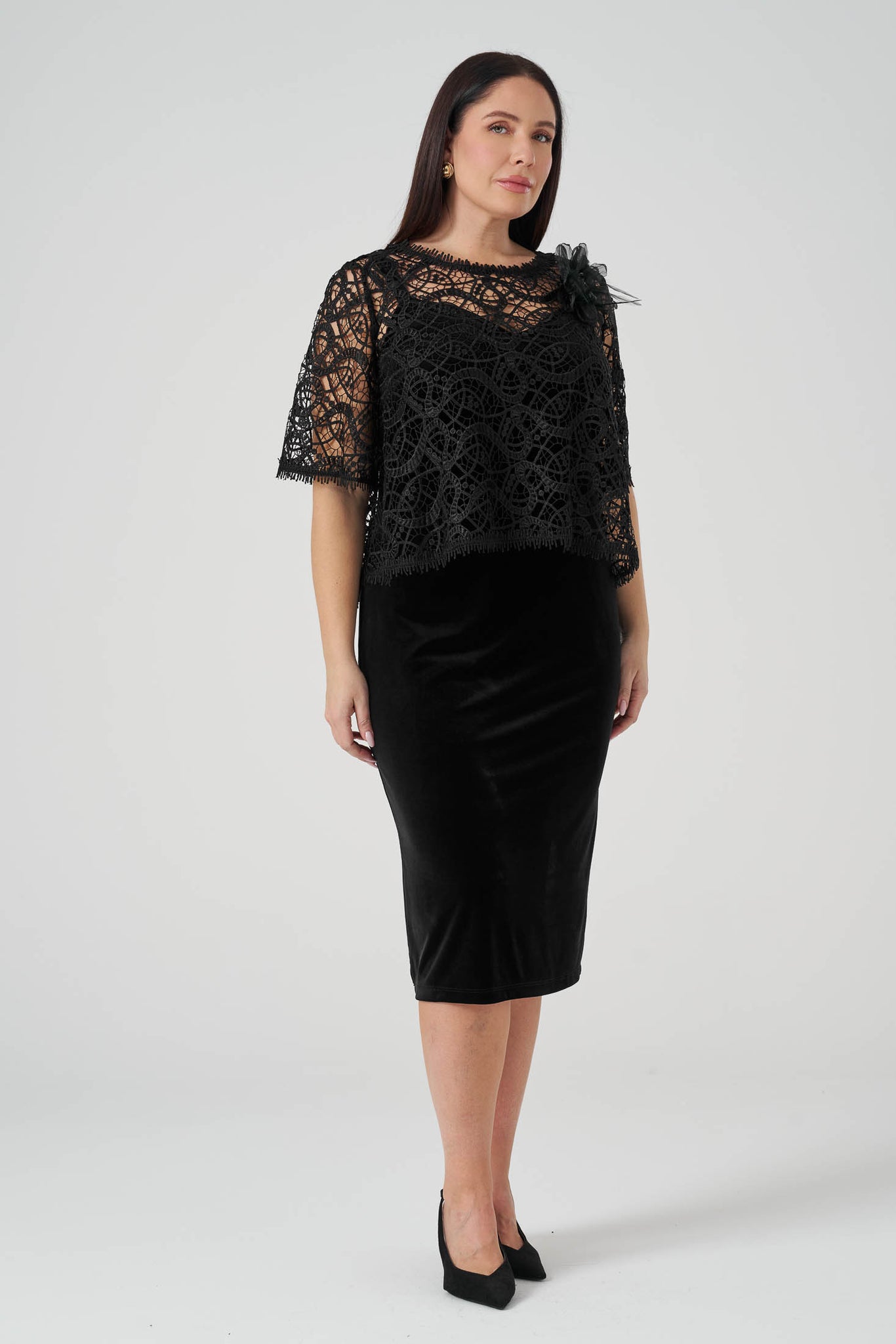 Güpür Bluzlu Kadife Elbiseli Takım Siyah