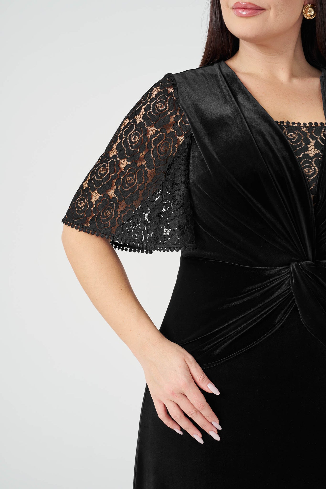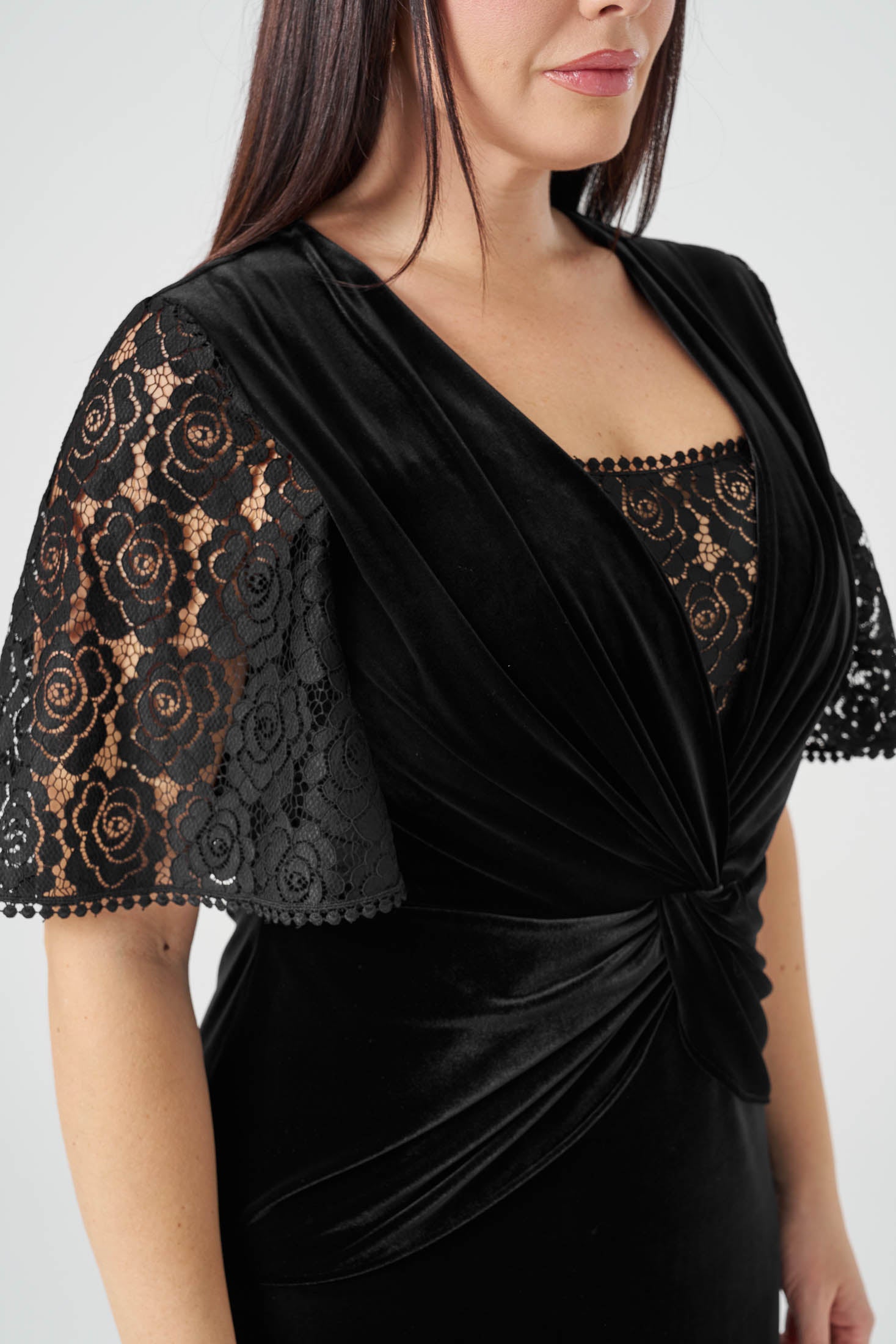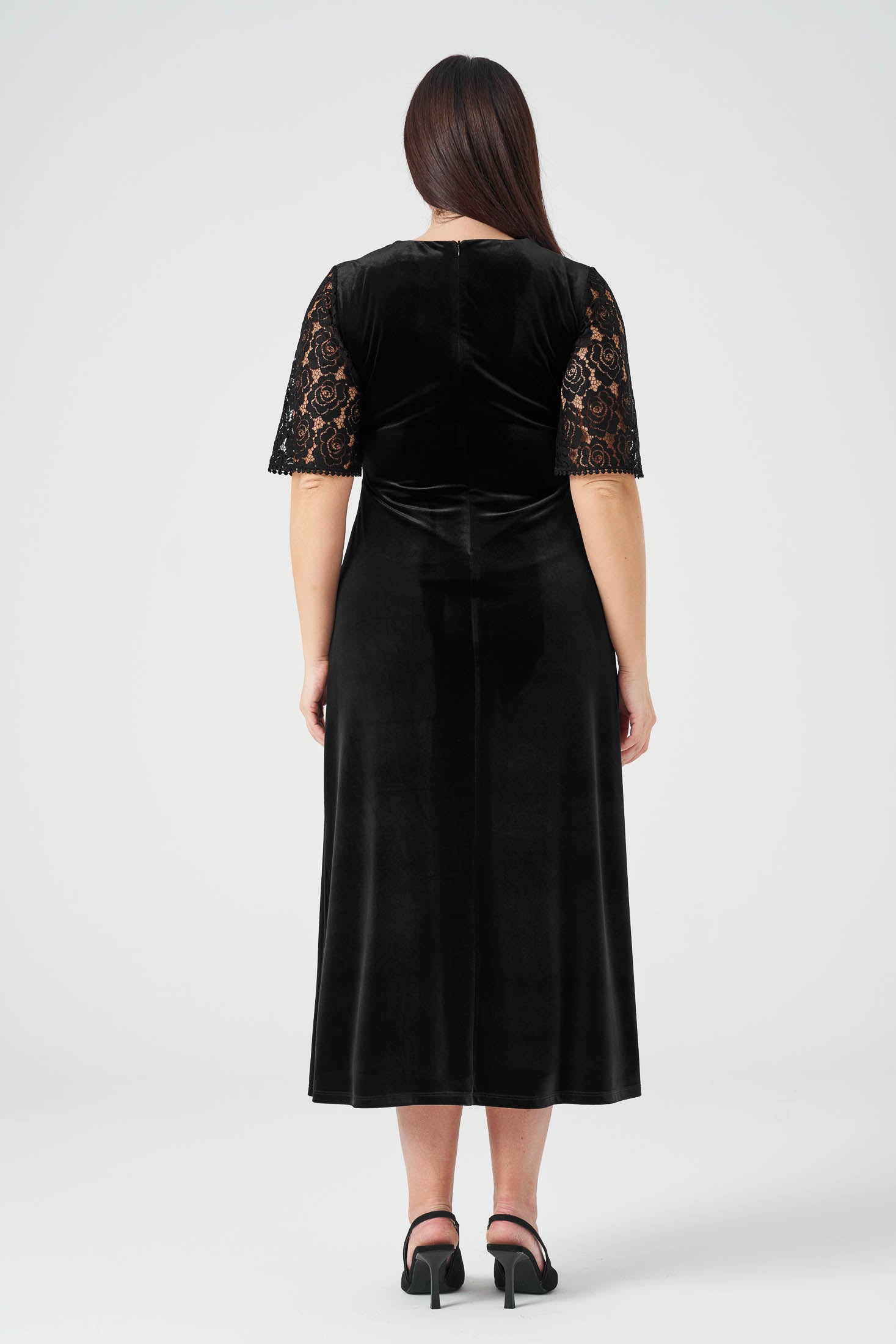 Kolları Dantelli Maxi Boy Kadife Elbise Siyah