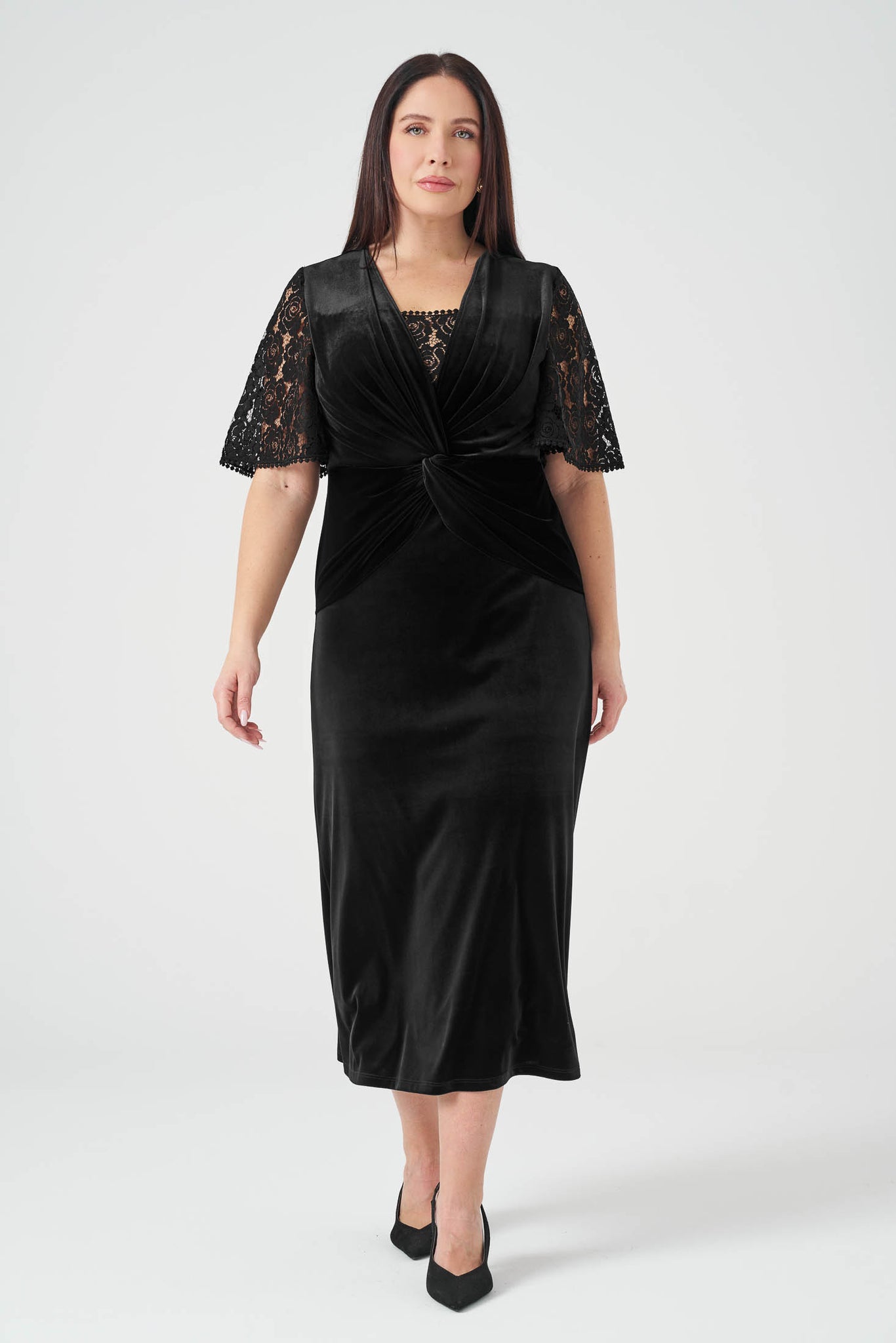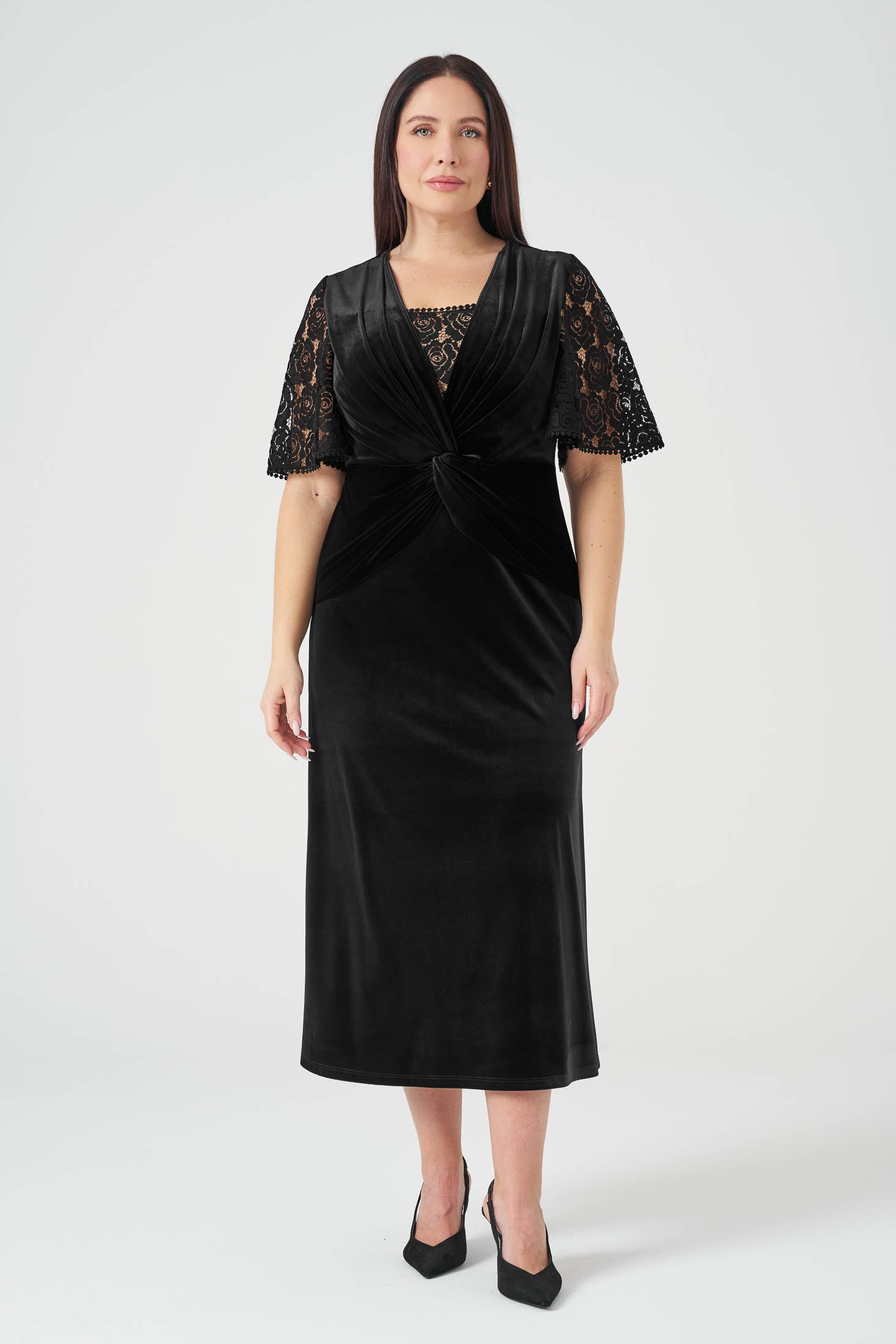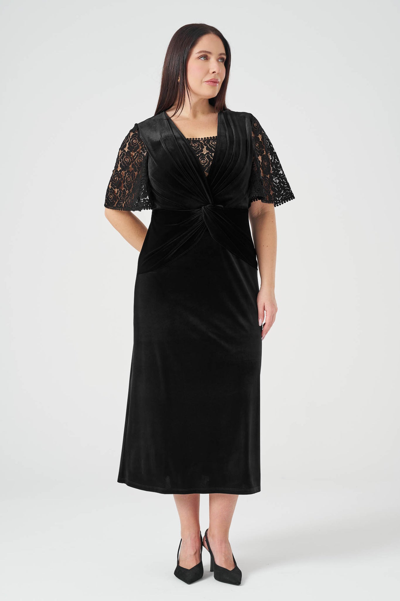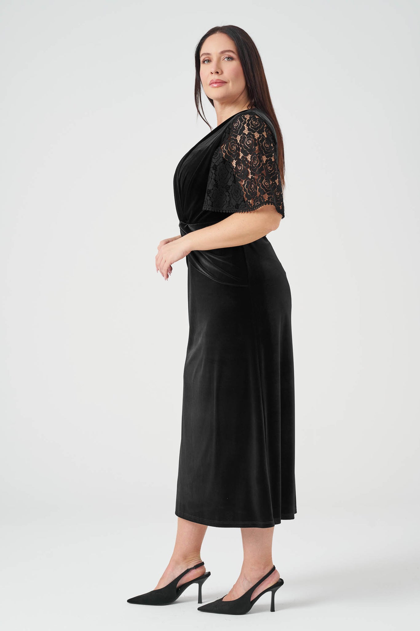 Kolları Dantelli Maxi Boy Kadife Elbise Siyah