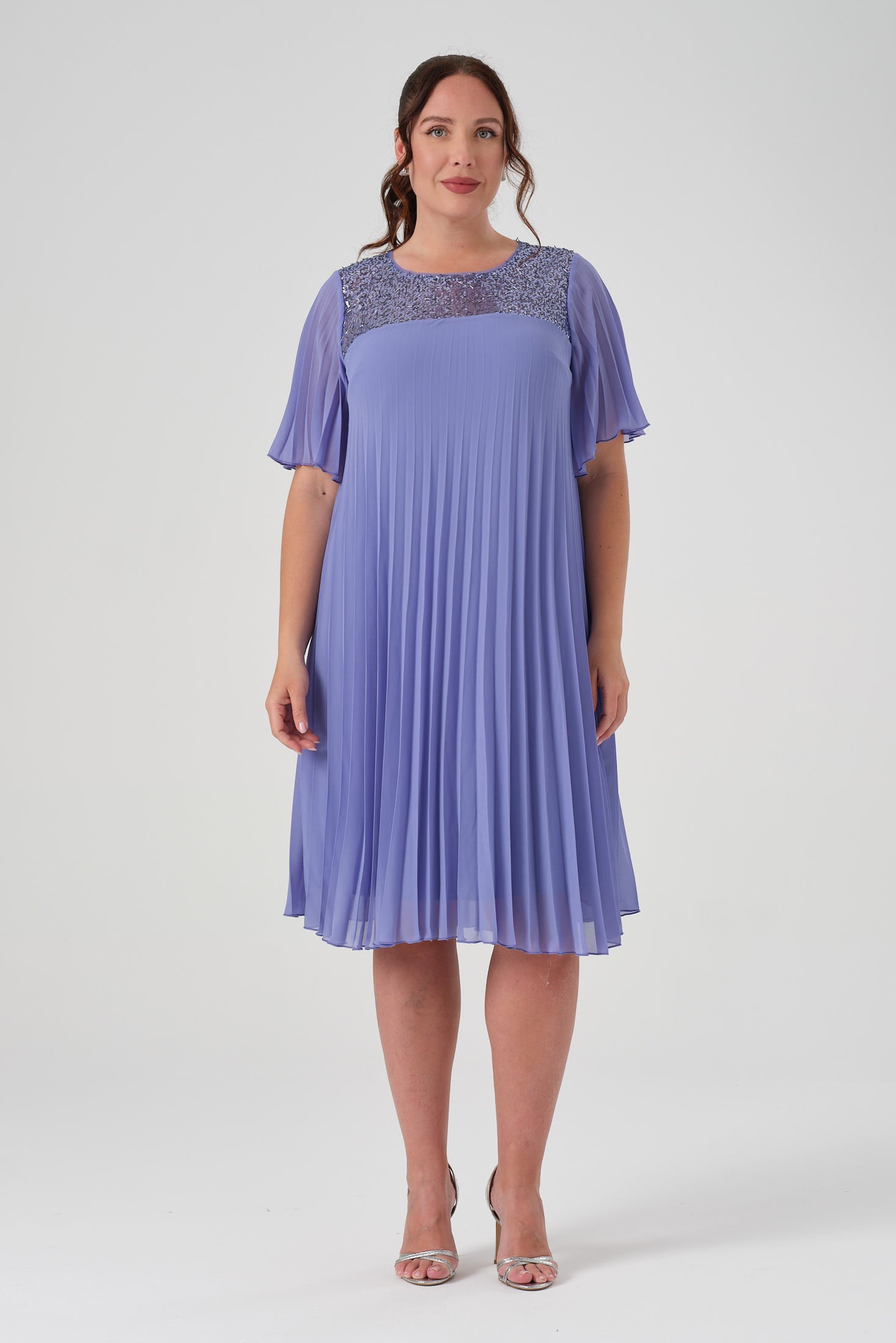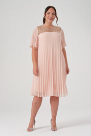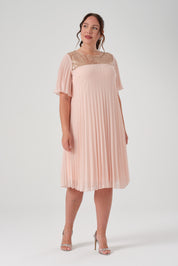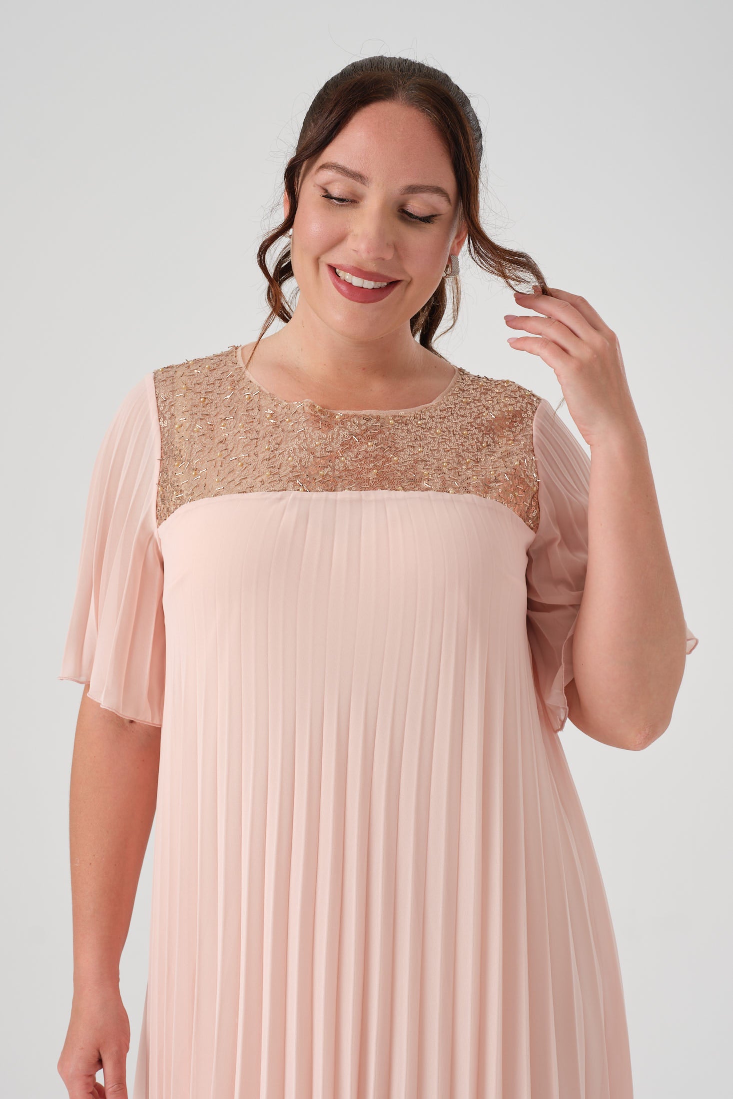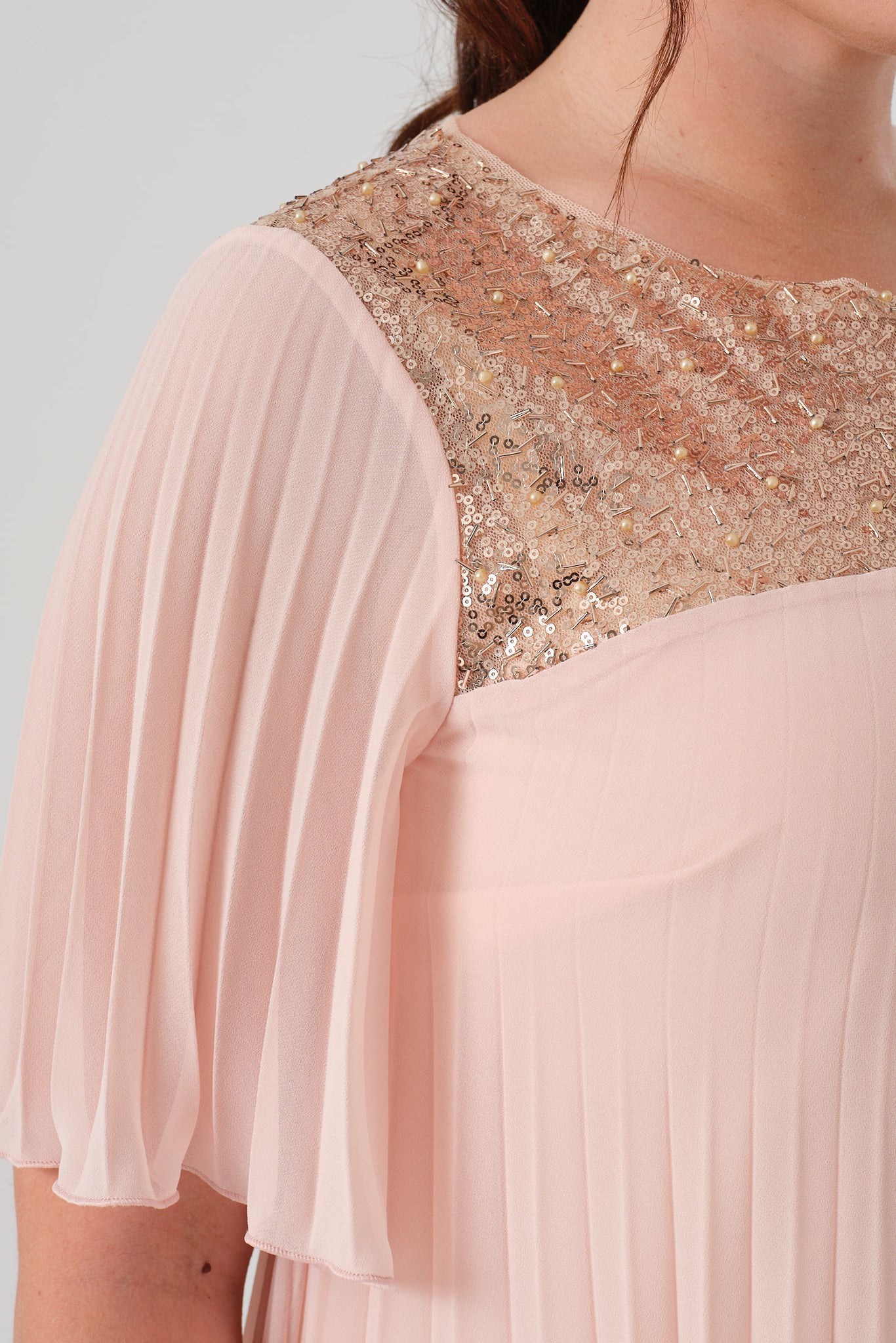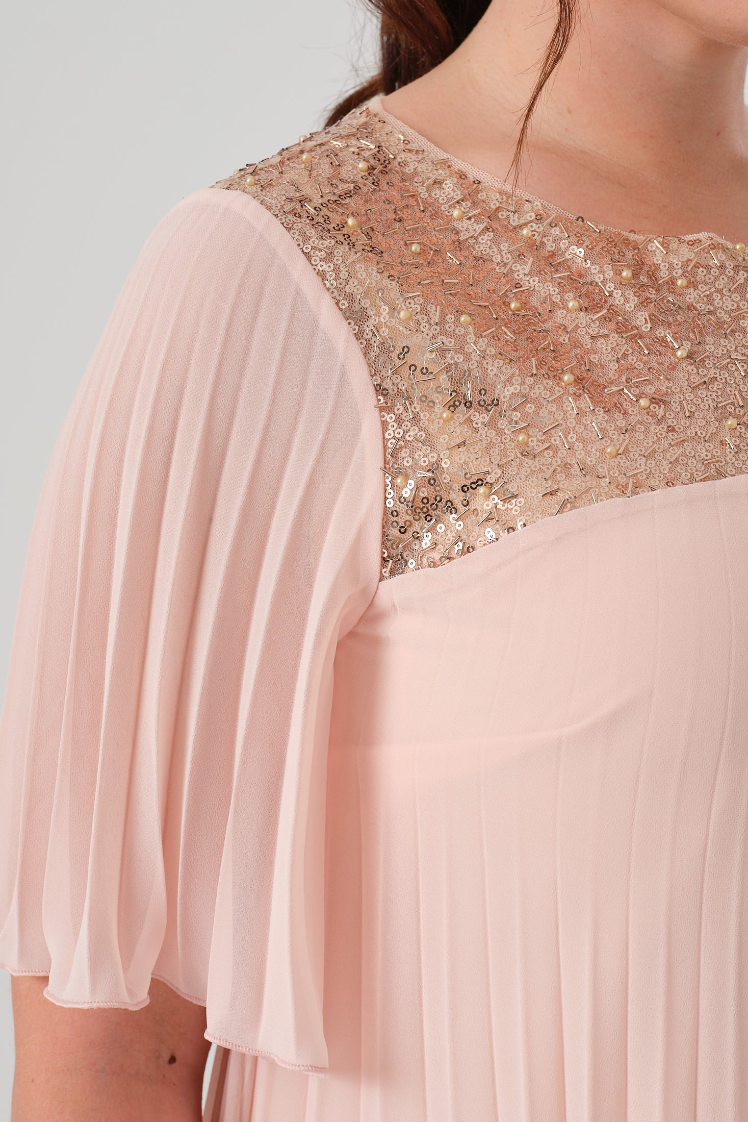 Boru Boncuklu Tül Detaylı Piliseli Elbise -Somon