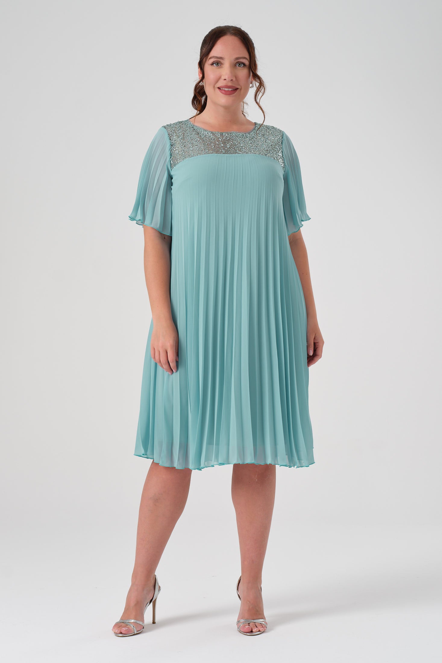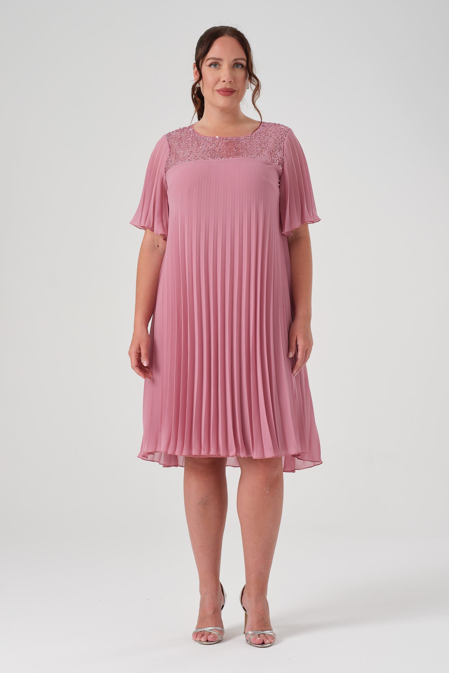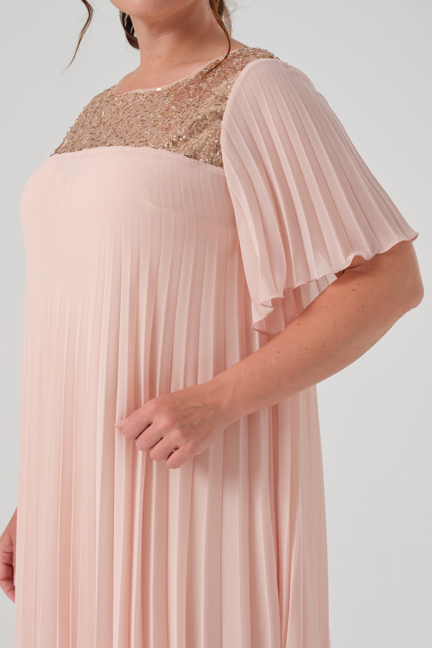 Boru Boncuklu Tül Detaylı Piliseli Elbise -Somon