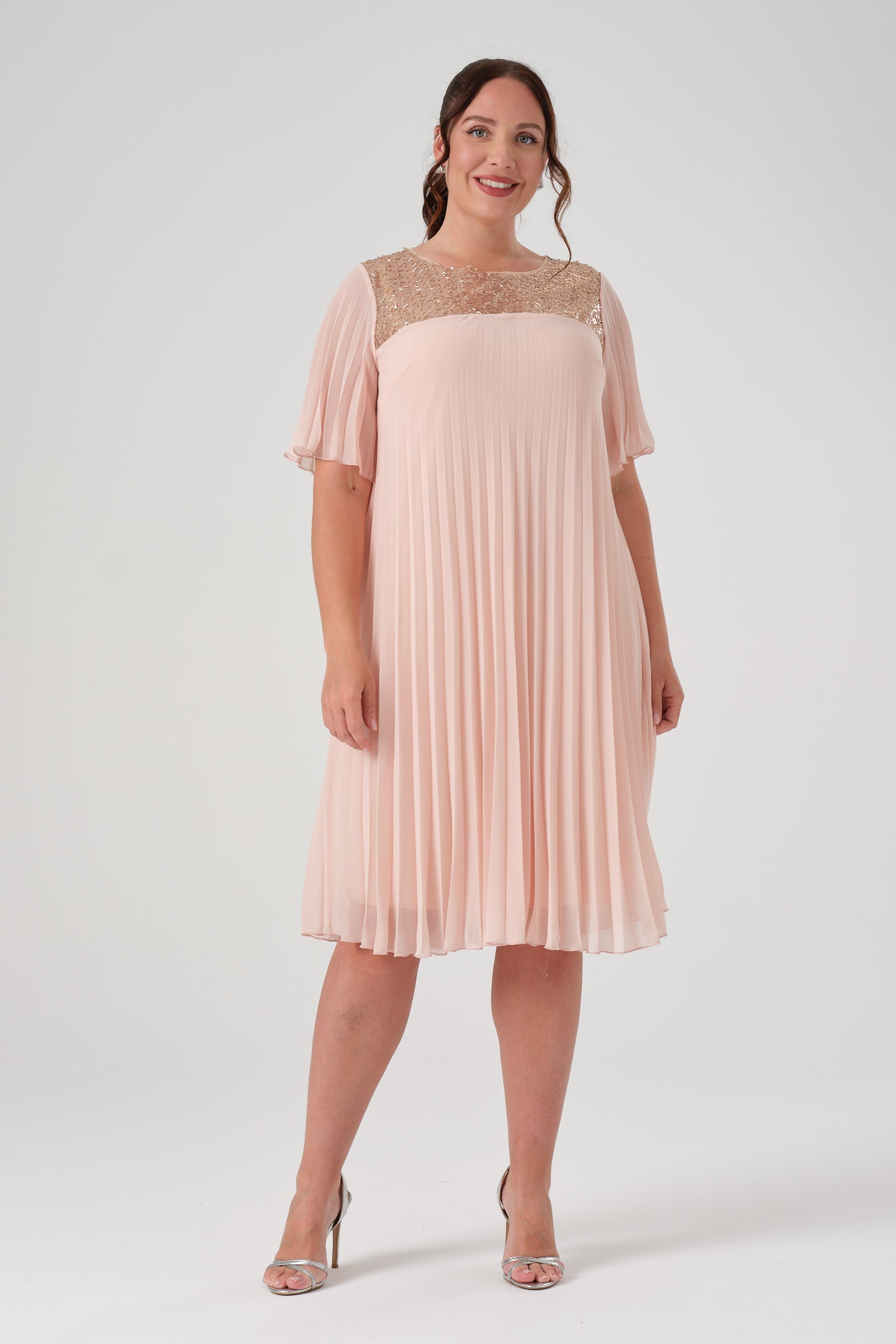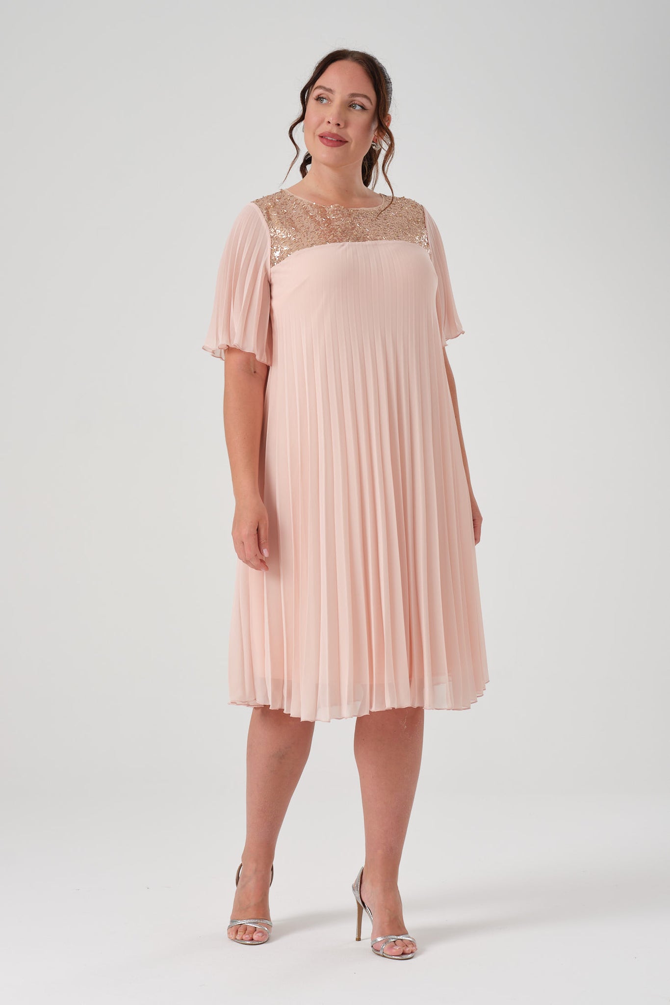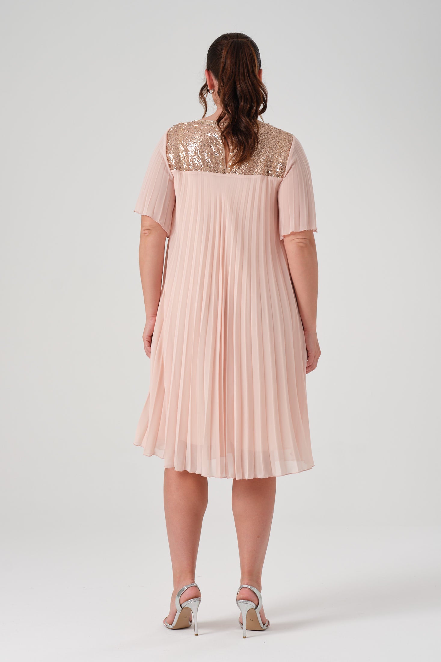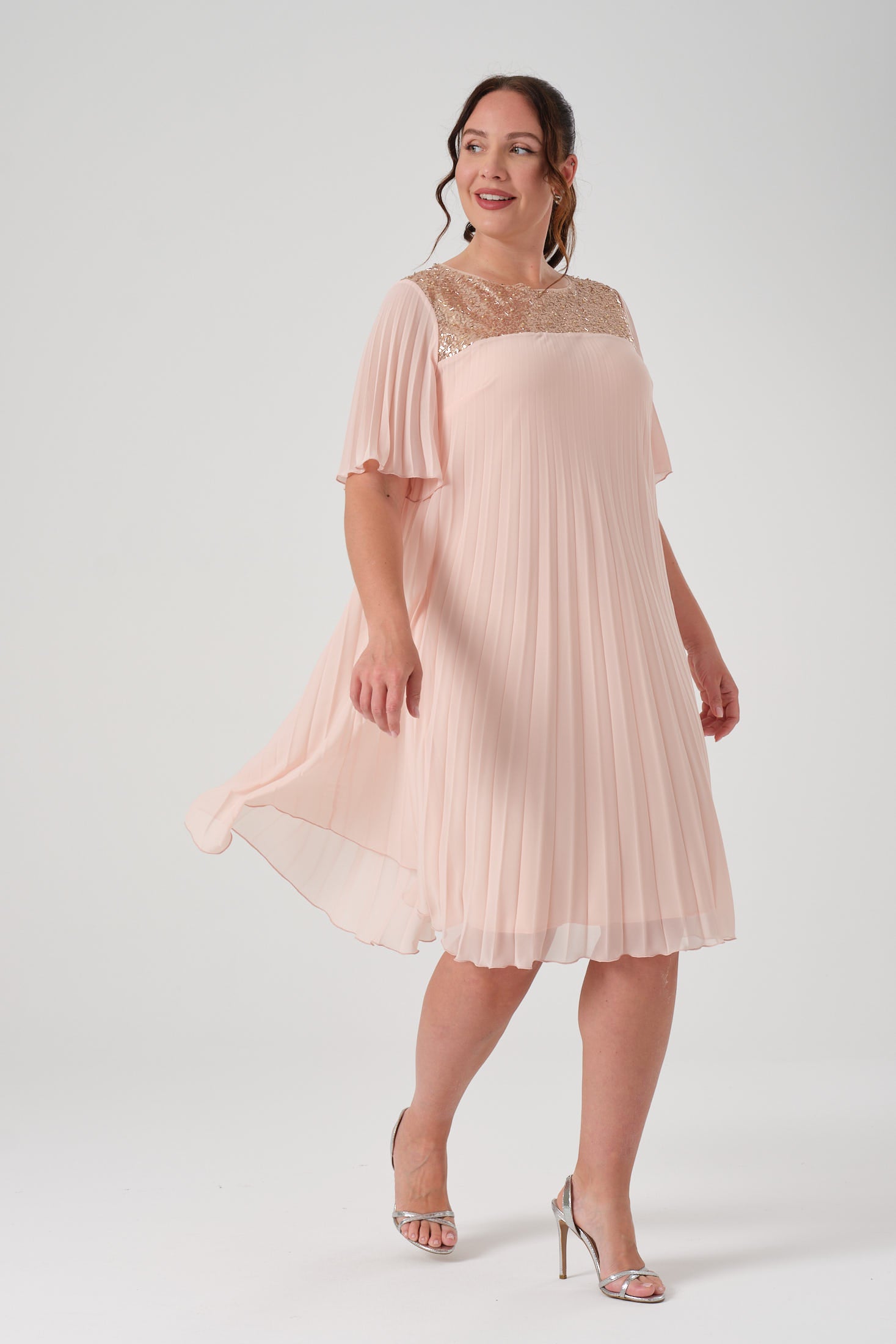 Boru Boncuklu Tül Detaylı Piliseli Elbise -Somon